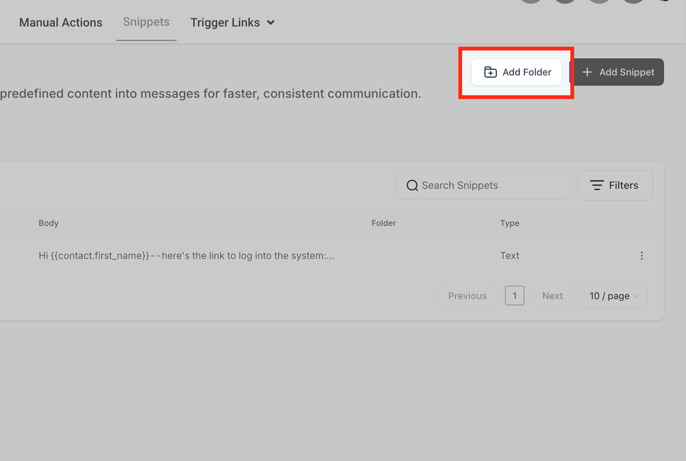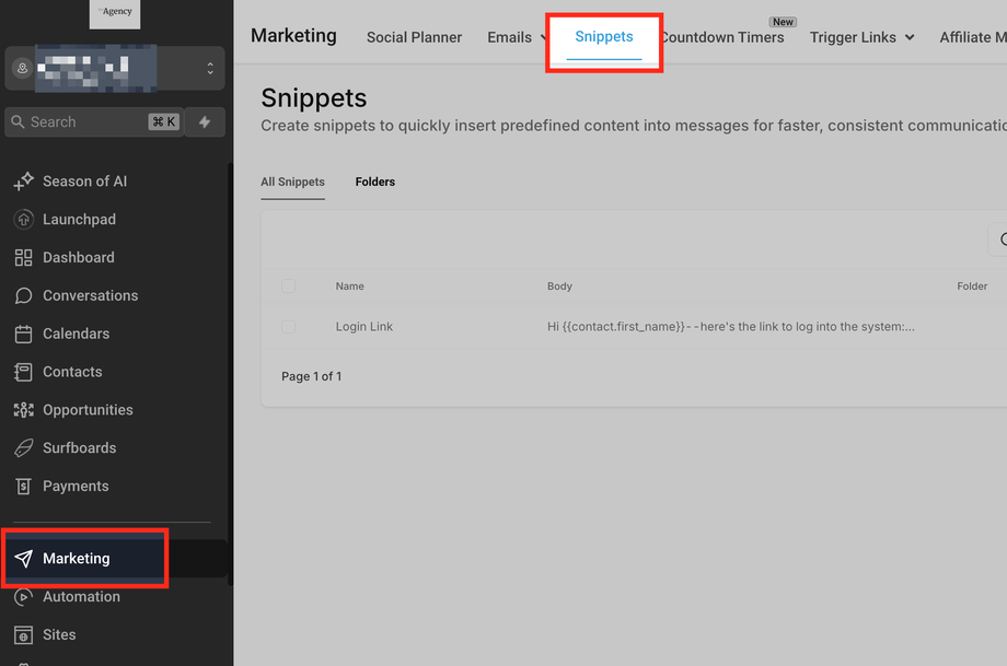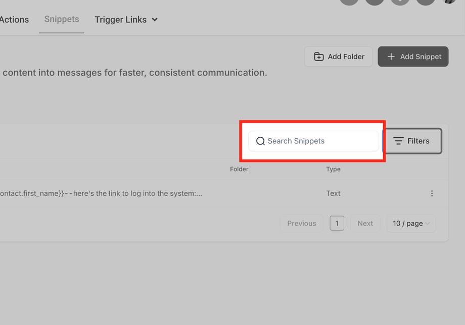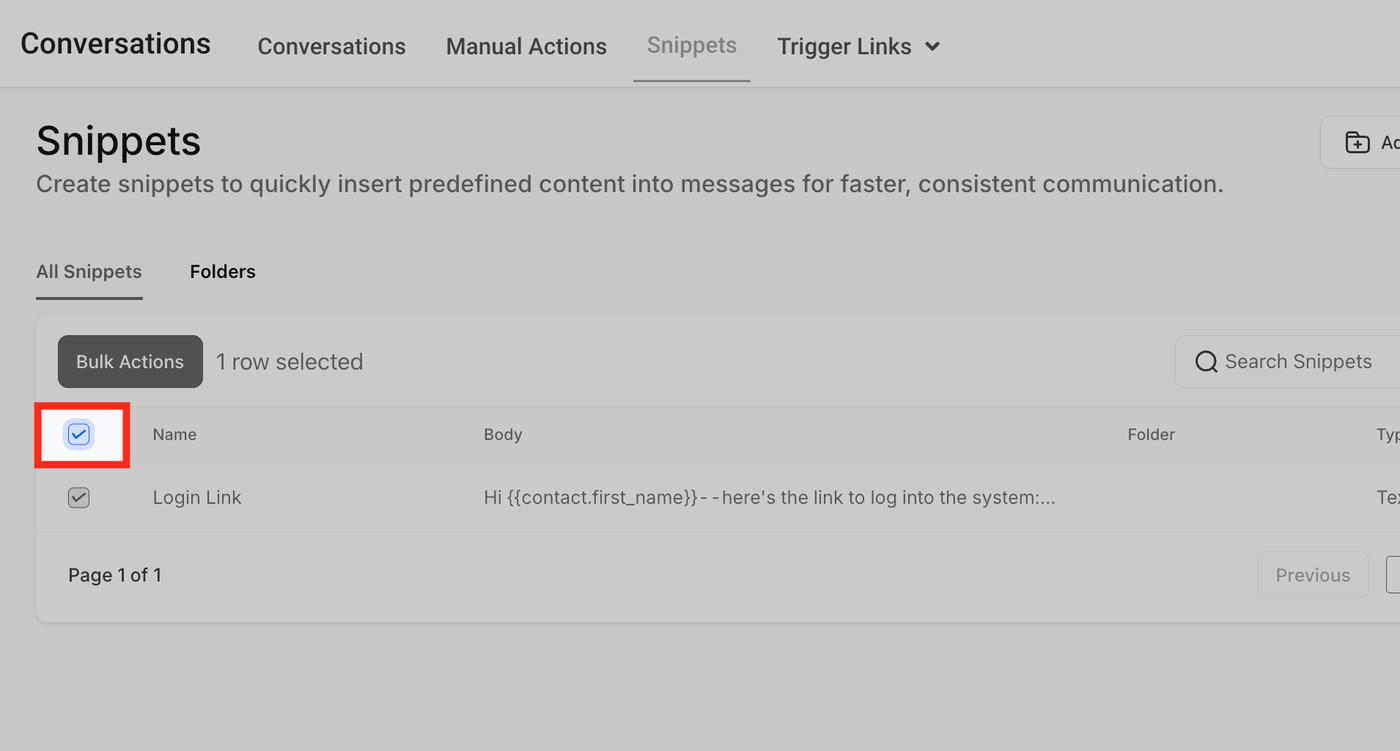 Gehen Sie zu Conversations > Snippets oder Marketing > Snippets.