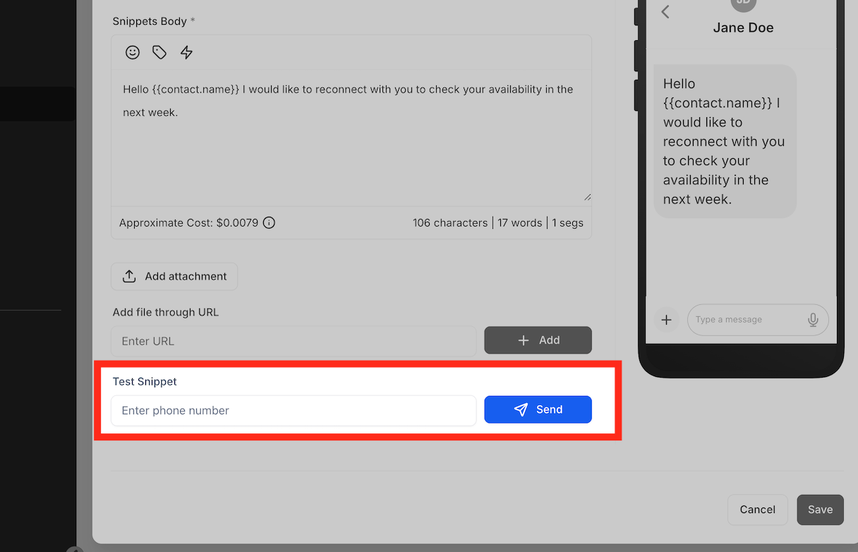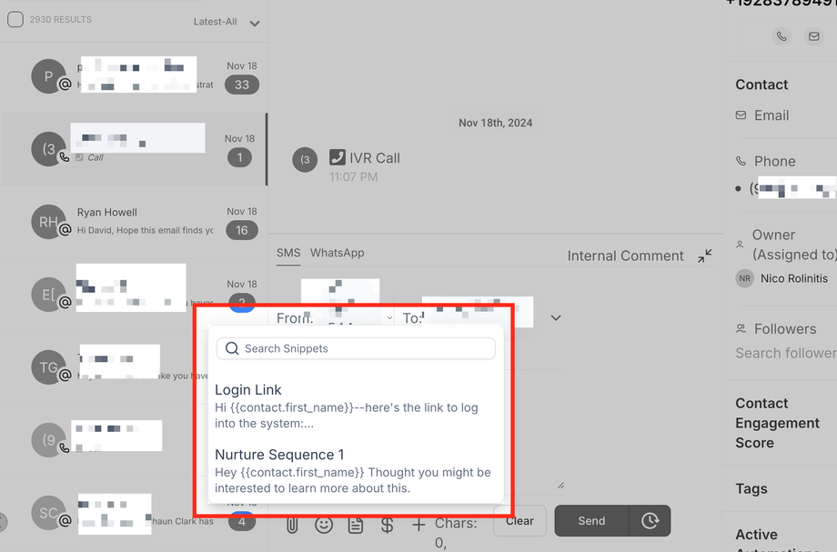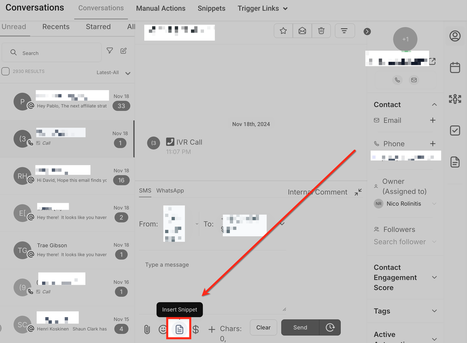 Öffnen Sie einen Gesprächs-Thread und klicken Sie auf das Snippets-Symbol unten.