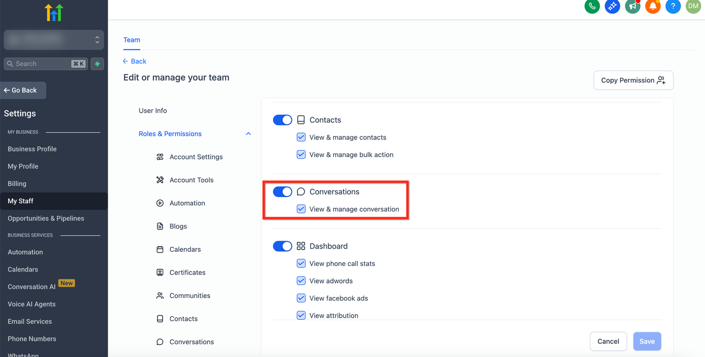 Stellen Sie sicher, dass der Conversations-Toggle aktiviert ist und View & manage conversation ausgewählt ist.