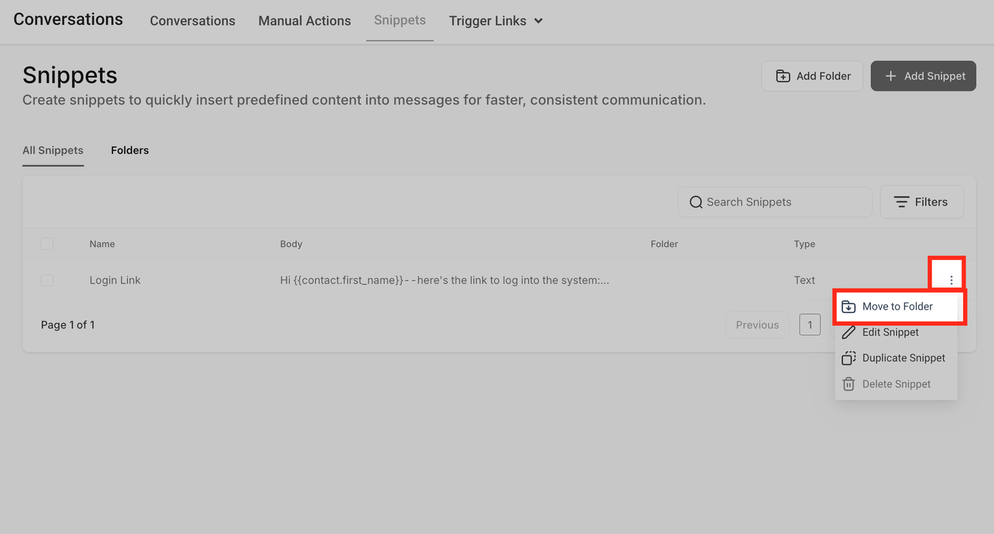 Wählen Sie ein Snippet, klicken Sie auf das Drei-Punkte-Menü und wählen Move to Folder.