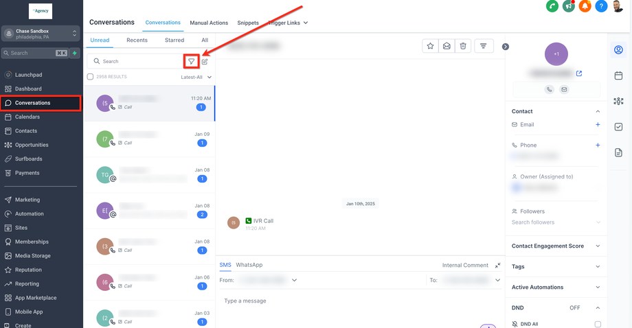 Klicke auf das Filter-Symbol im Konversationsbereich