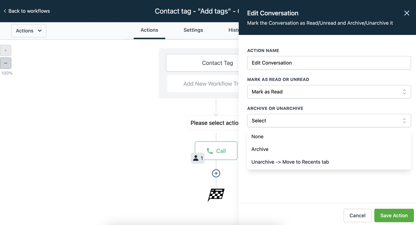 Verwenden Sie eine Workflow-Aktion, um die Konversation zu bearbeiten