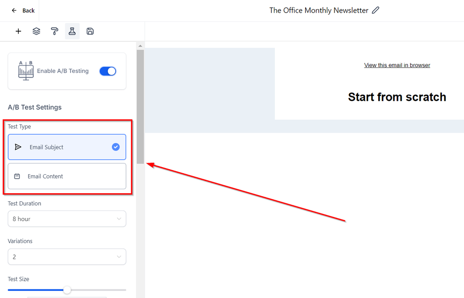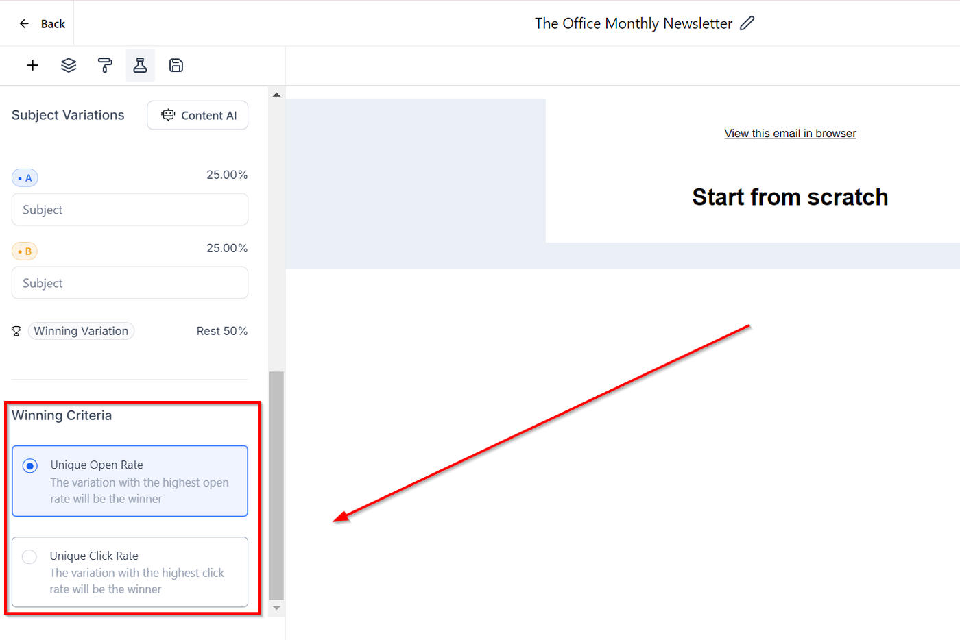 Schritt 2: Wähle, was getestet werden soll: E-Mail-Betreffzeile oder E-Mail-Inhalt.
