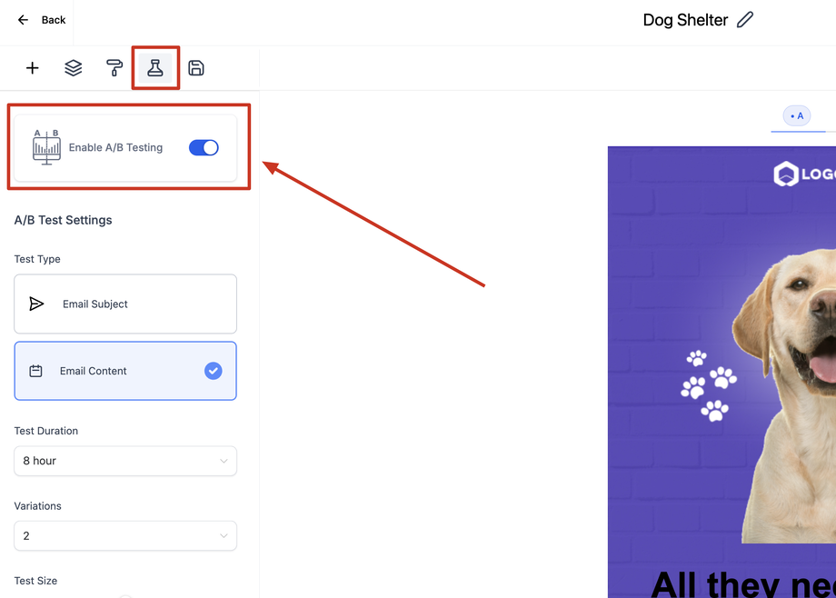 Schritt 1: Gehe zu Marketing > E-Mails > Kampagne. Nach dem Erstellen einer neuen E-Mail-Kampagne gibt es die Option, „A/B-Testing“ zu aktivieren.
