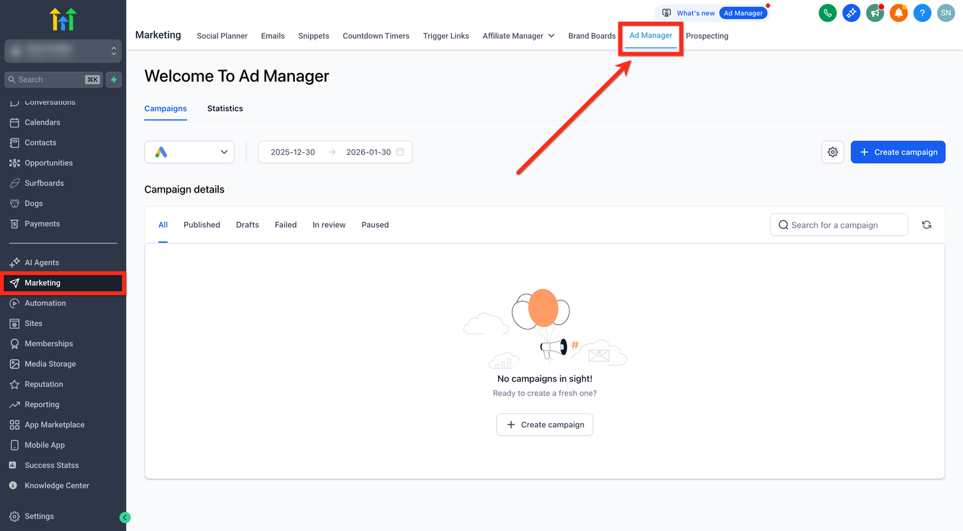 Klicken Sie auf „Ad Manager“ in der oberen Navigationsleiste, um zum Kampagnen-Dashboard zu gelangen.