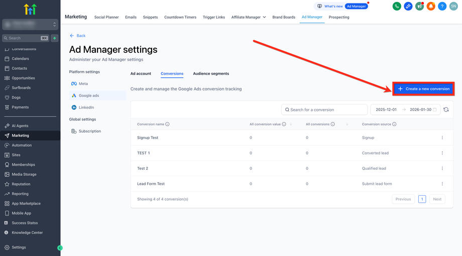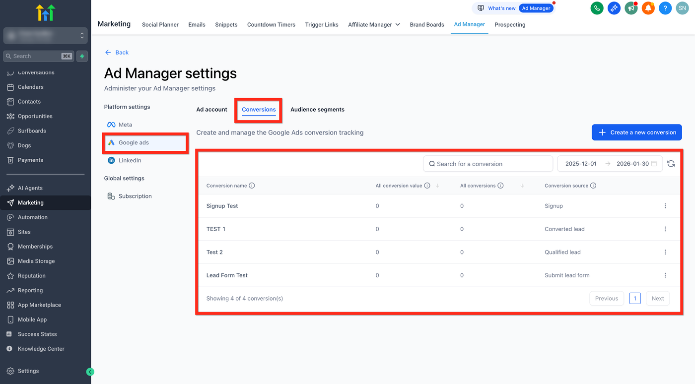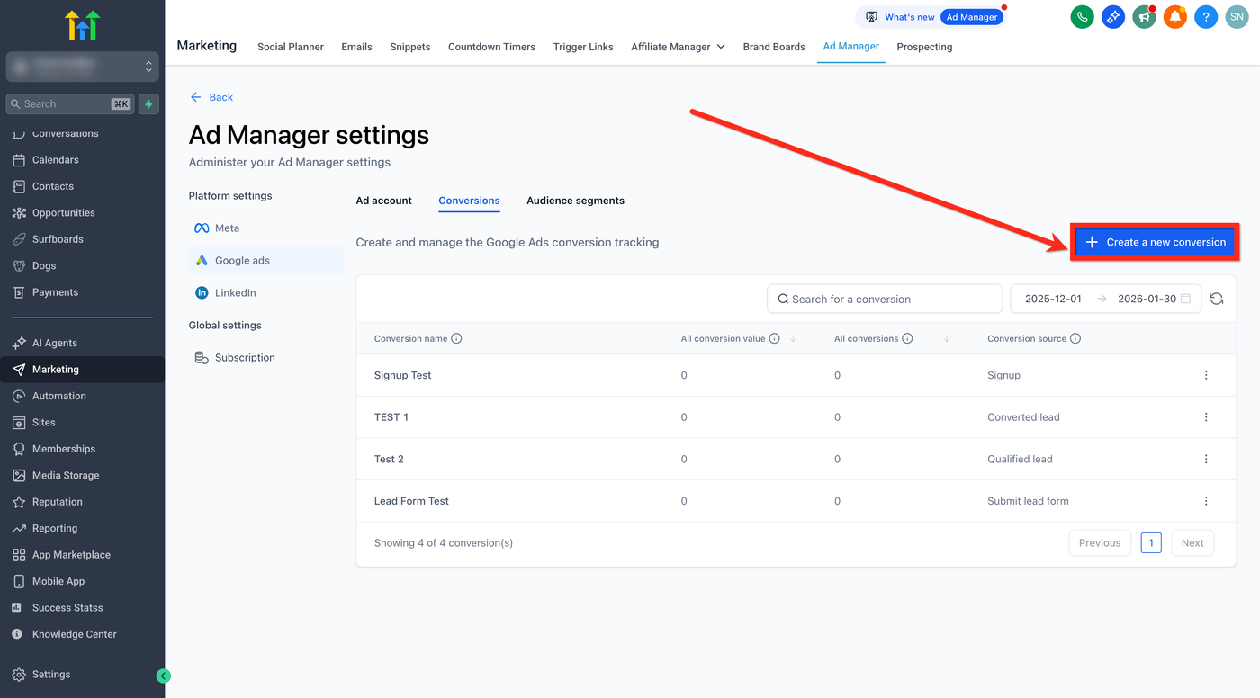 Hinweis: Bevor Sie Conversion-Aktionen im HighLevel Ad Manager einrichten, muss Ihr Google-Konto in HighLevel integriert sein.