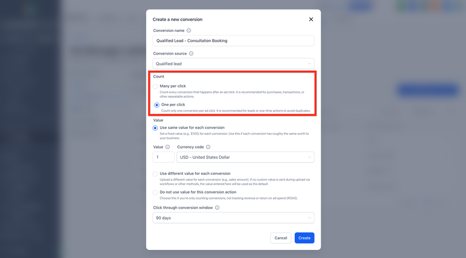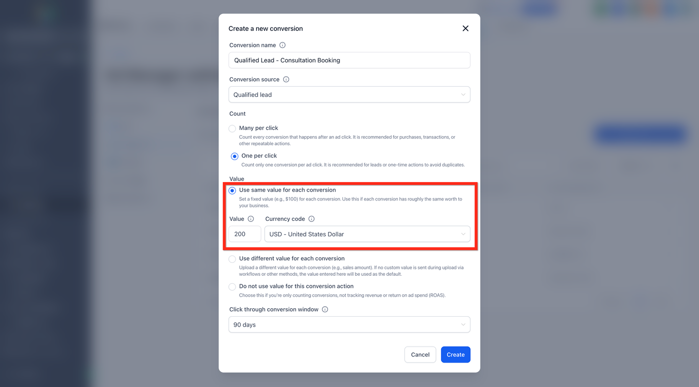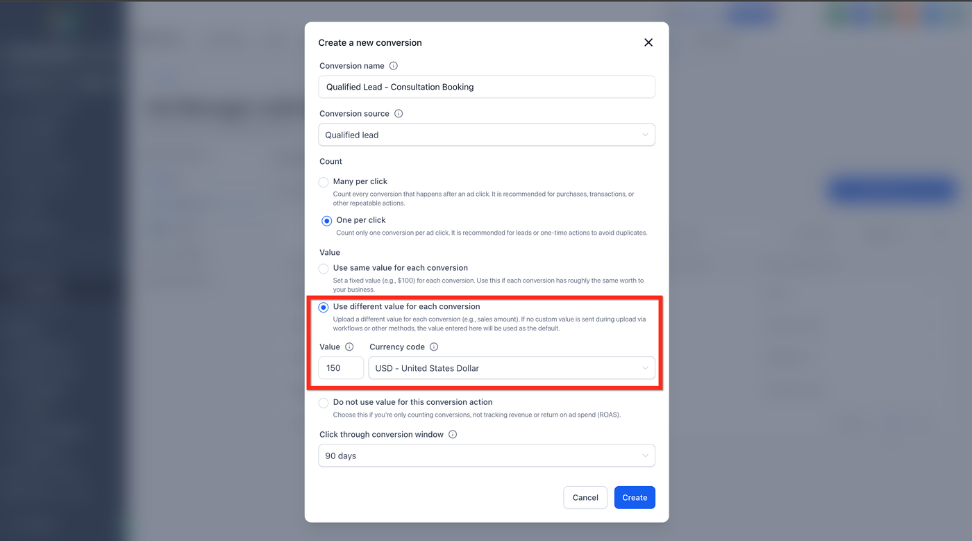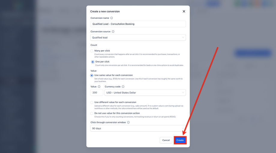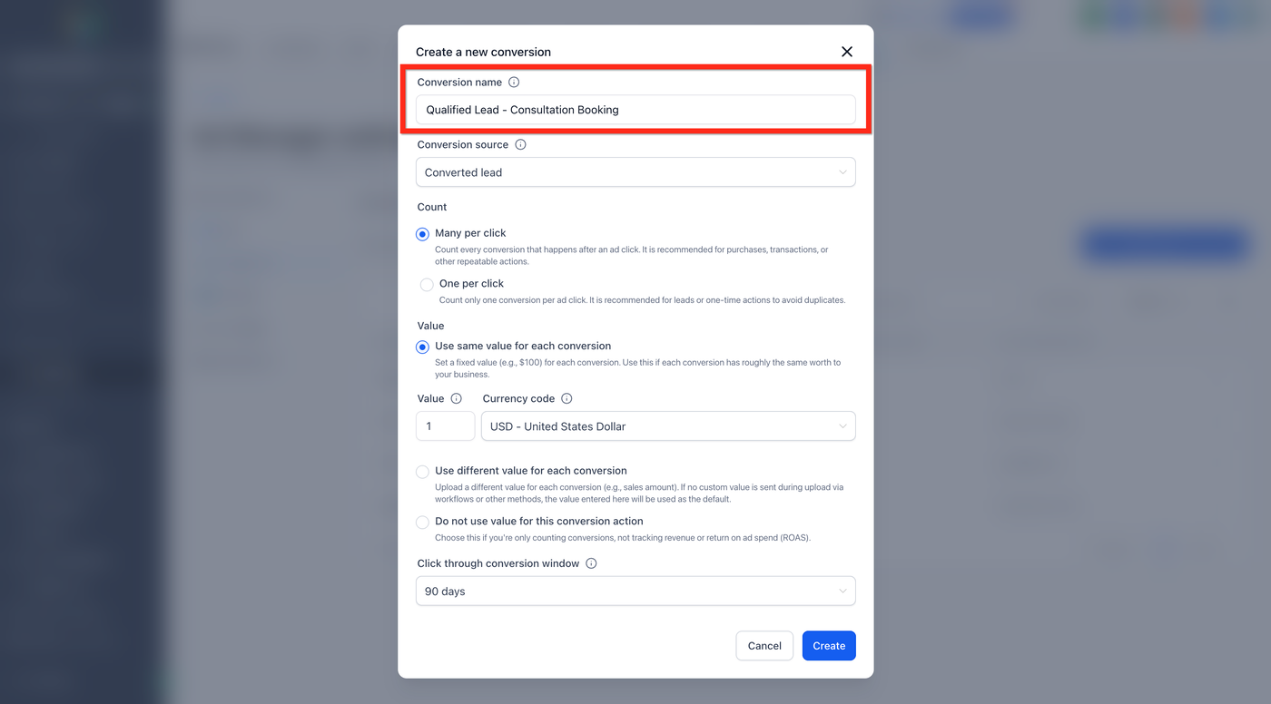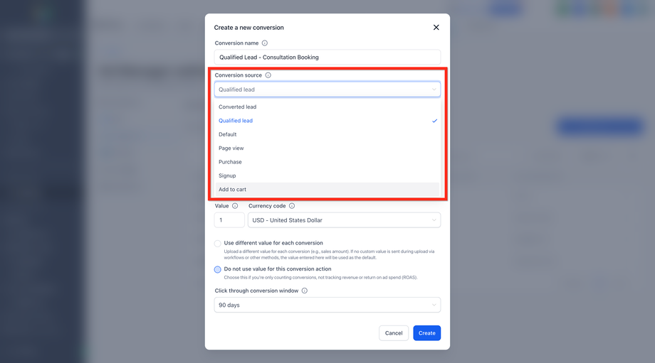 Wählen Sie die passende Conversion-Quelle aus dem Dropdown-Menü aus, z. B.: Converted Lead, Qualified Lead, Purchase, Signup usw.