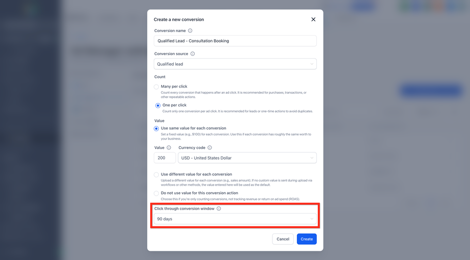 Legen Sie fest, wie lange Conversions nach Klicks verfolgt werden sollen (z. B. 30, 60, 90 Tage oder benutzerdefinierte Dauer).