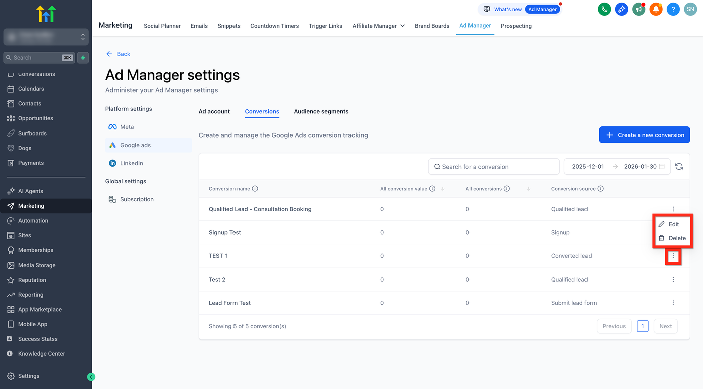 F: Kann ich bestehende Google Ads Conversions in HighLevel bearbeiten oder löschen?