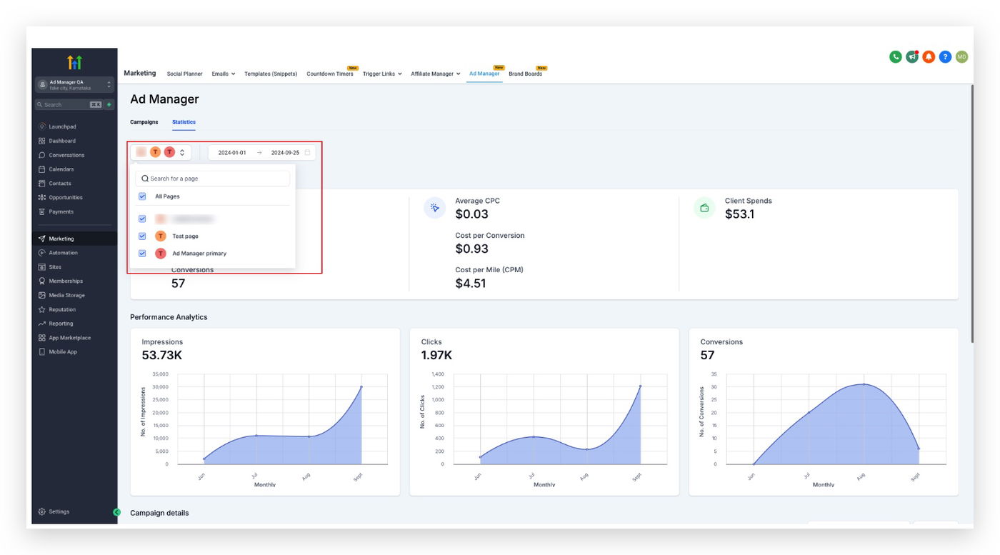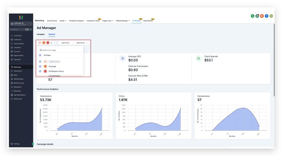 Hinweis: Ein Seitenfilter kann ebenfalls hinzugefügt werden, um nur Statistiken der Kampagnen anzuzeigen, die auf ausgewählten Seiten veröffentlicht wurden.