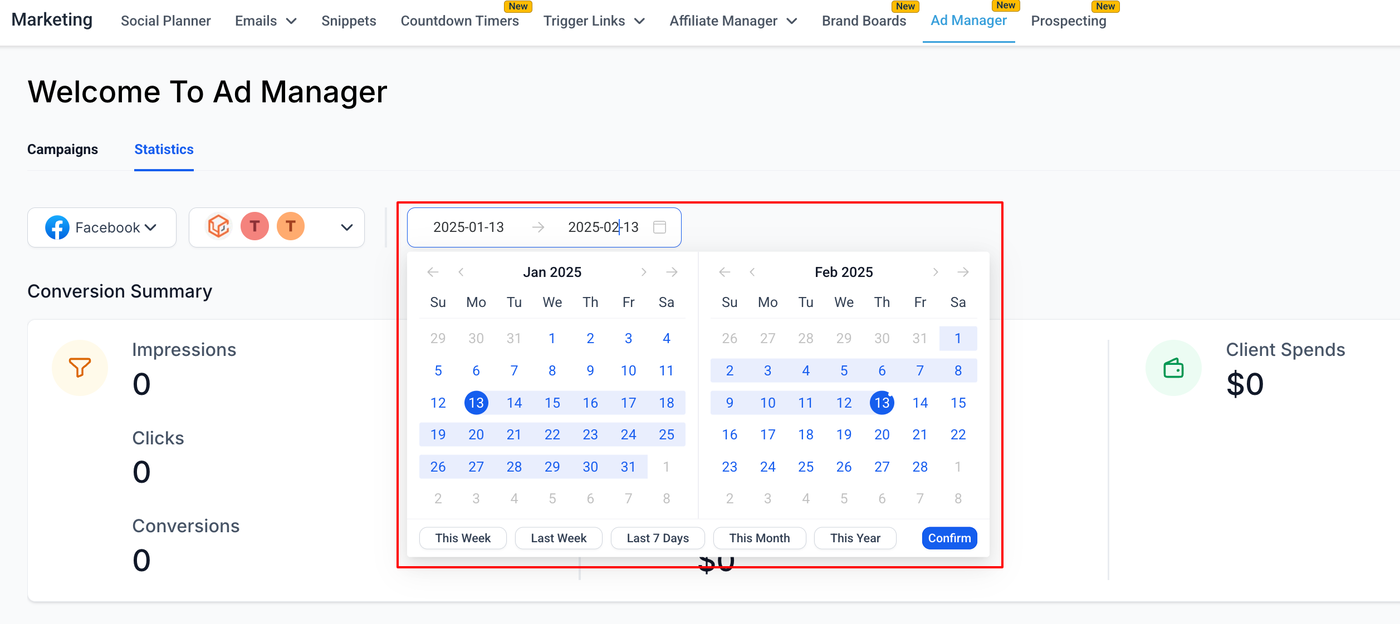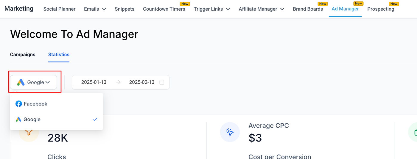 Für Facebook bleibt alles gleich wie bei Google, mit der zusätzlichen Möglichkeit eines Seitenfilters. Dieser hilft dabei, die Statistikansicht weiter einzugrenzen und nur Kampagnen anzuzeigen, die auf bestimmten Facebook-Seiten veröffentlicht wurden.