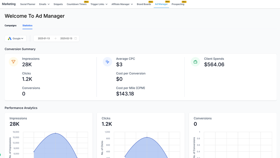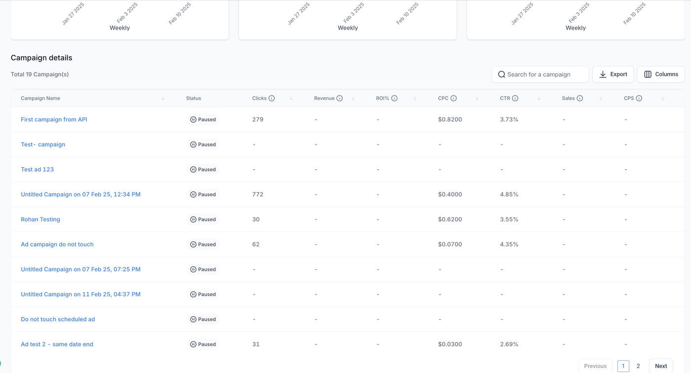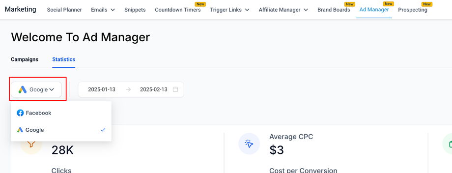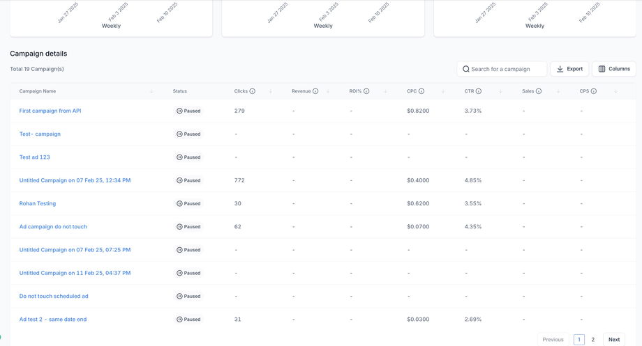 Auf der Startseite des Ad Managers sind zwei Registerkarten vorhanden: Kampagnen (standardmäßig ausgewählt) und Statistiken. Klicken Sie auf die Registerkarte Statistiken, um eine neue Seite zu öffnen, die verschiedene Kennzahlen zu allen veröffentlichten und pausierten Kampagnen anzeigt.