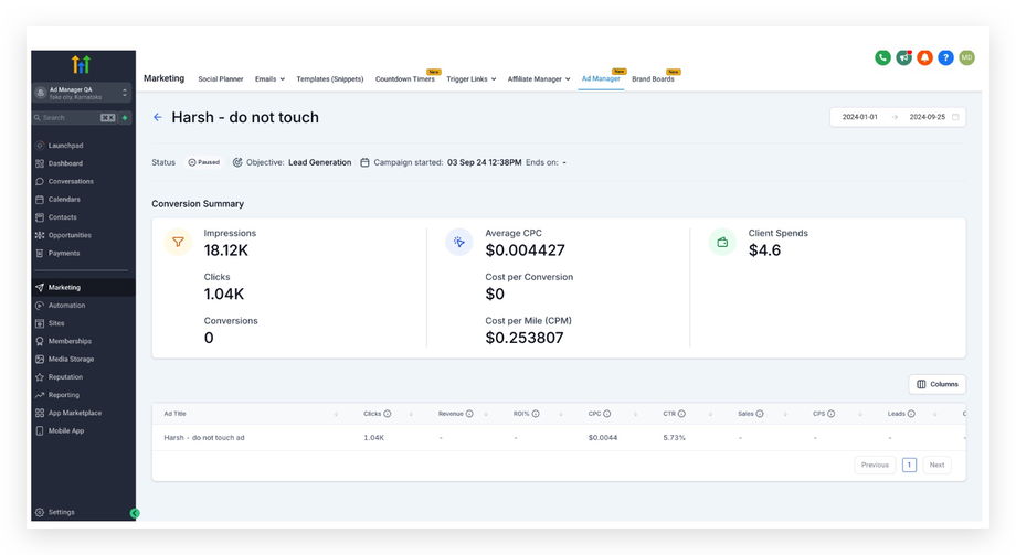 Wenn ein Benutzer auf den Namen einer einzelnen Kampagne klickt, wird eine neue Seite mit spezifischen Statistiken zu dieser ausgewählten Werbekampagne geöffnet.