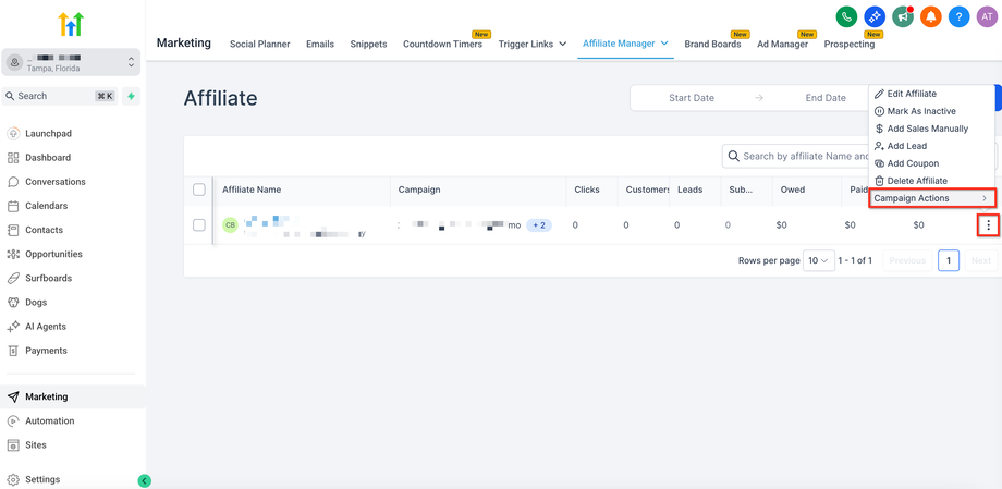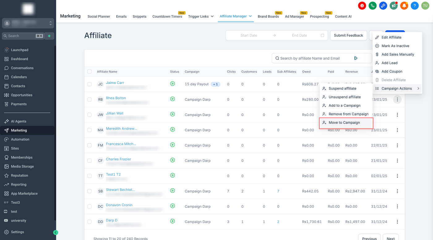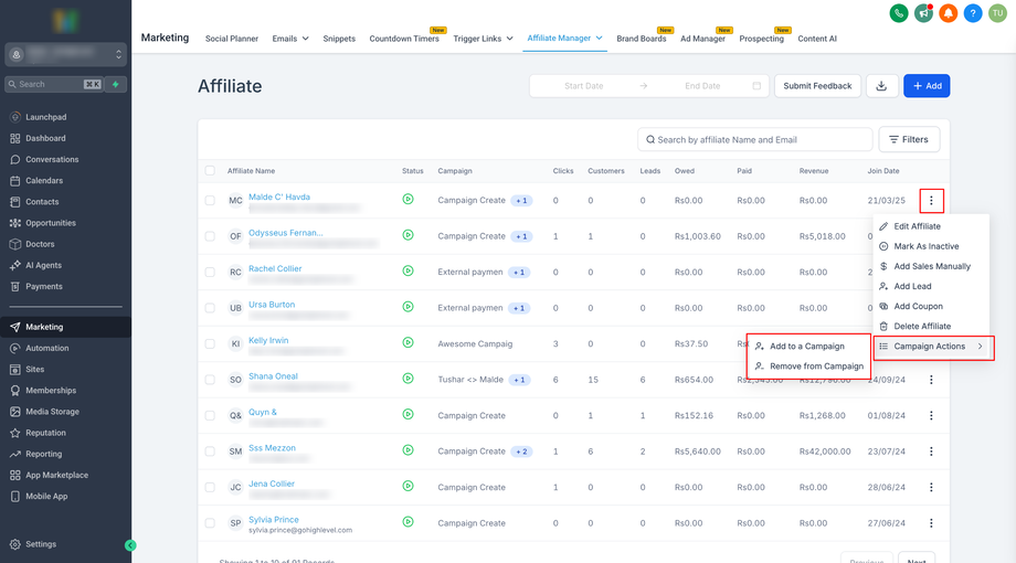 Verwalten Sie Affiliate-Zuweisungen schnell: Fügen Sie Affiliates hinzu, entfernen Sie sie, setzen Sie sie aus oder verschieben Sie sie zwischen Kampagnen – alles ohne das Profil zu öffnen – mit den Quick Campaign Actions in der Affiliate-Liste von HighLevel.