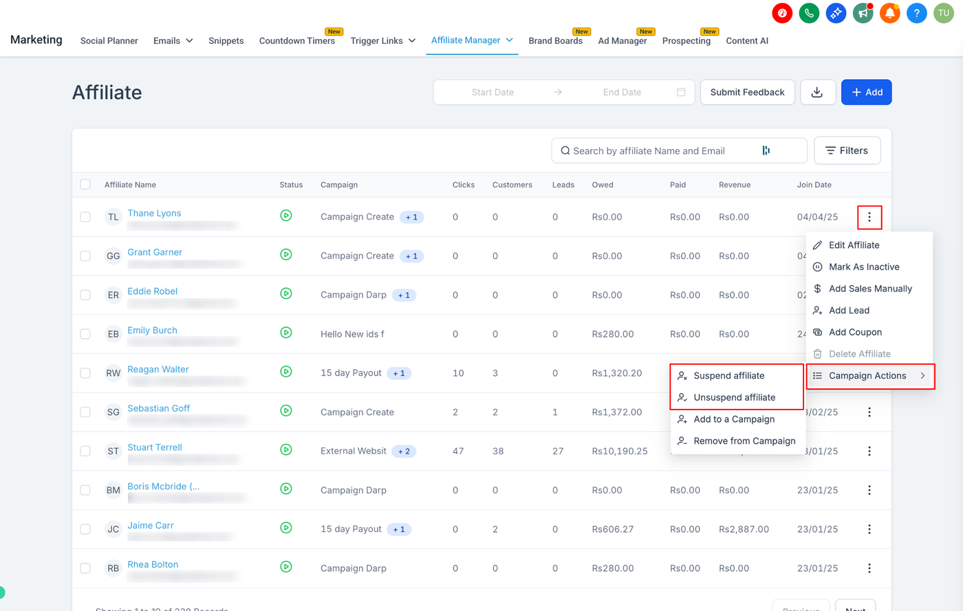 Quick Campaign Actions bieten schnellen Zugriff auf die Affiliate-Verwaltung direkt von der Affiliate-Liste. Sie müssen nicht jedes Profil öffnen – klicken Sie einfach auf das Drei-Punkte-Menü neben dem Affiliate und wählen Sie eine Aktion aus.