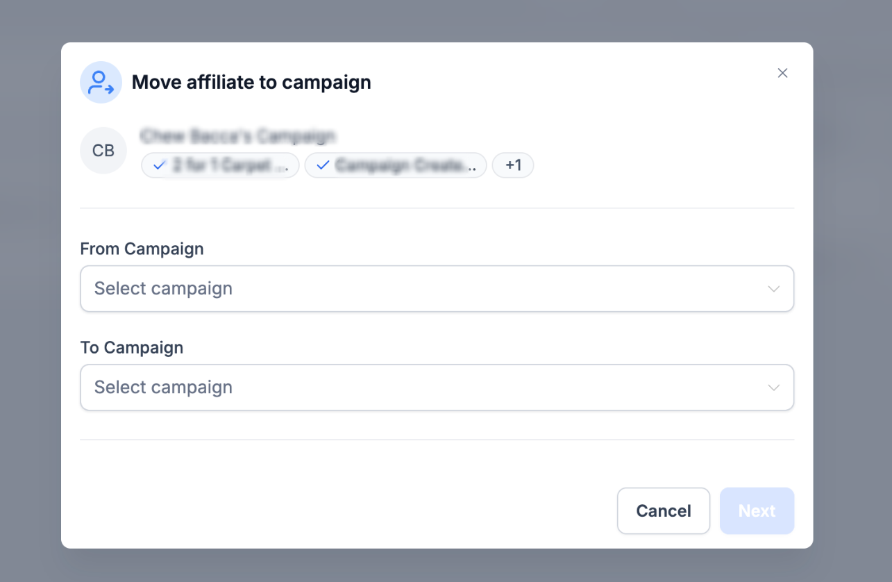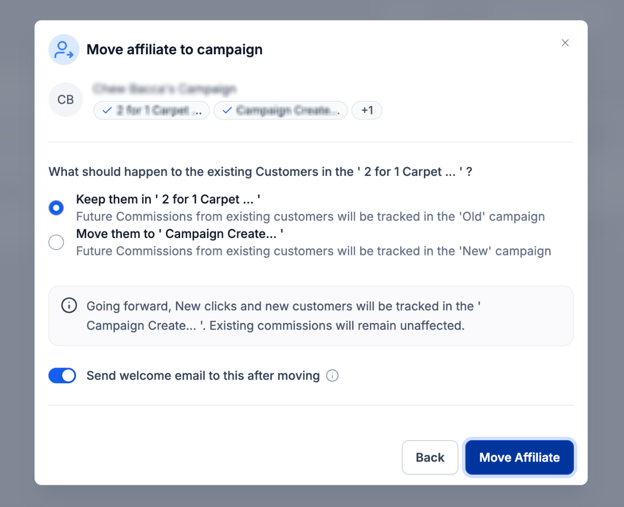 Verschieben von Affiliates zwischen Kampagnen, inklusive Optionen für bestehende Kunden.