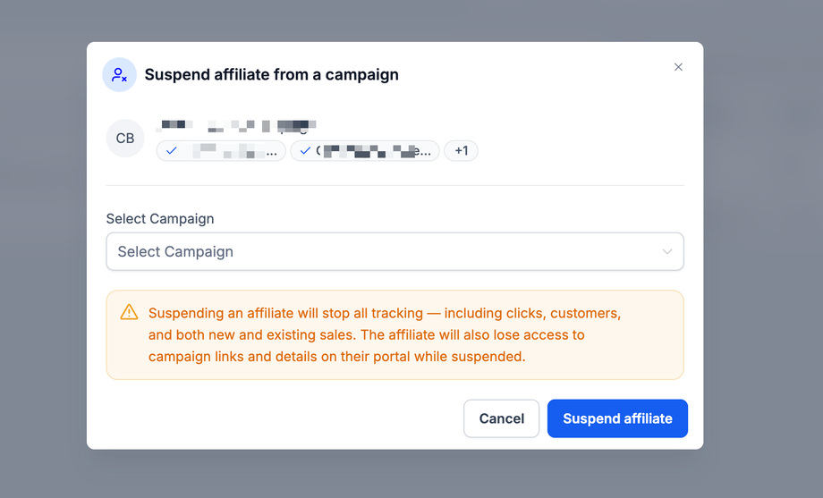 Schritt 1: Klicken Sie auf Campaign Actions → Suspend Affiliate
