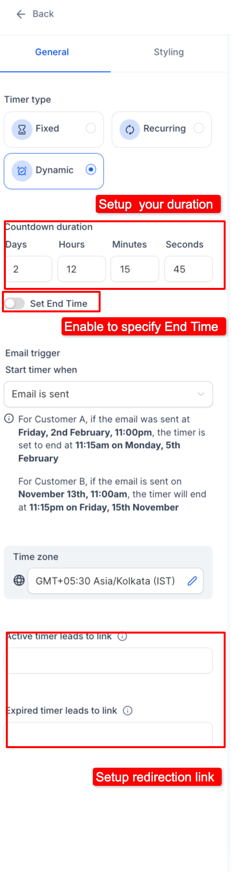 Wähle die Option „Dynamic“.Dauer & Endzeit festlegen