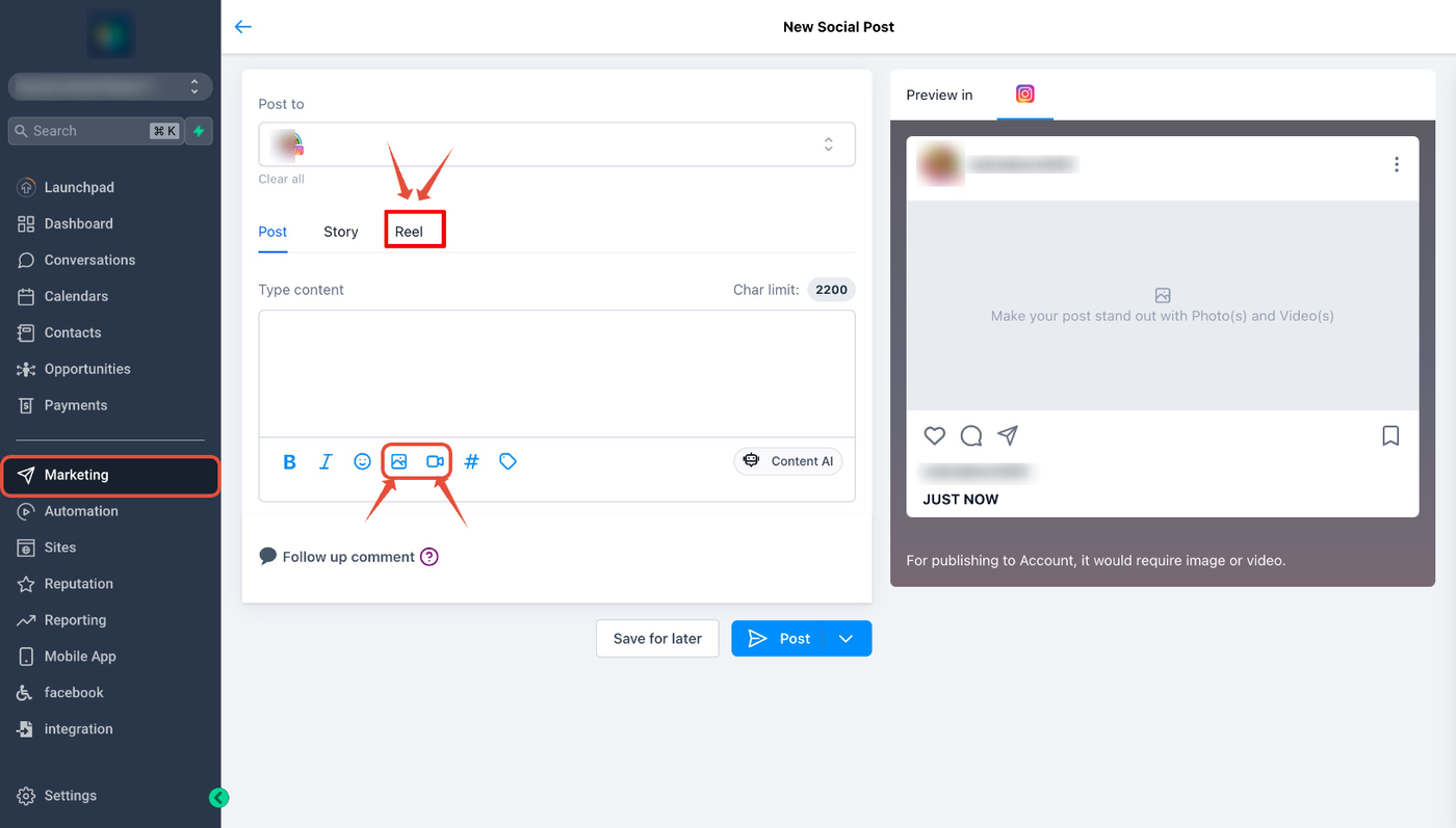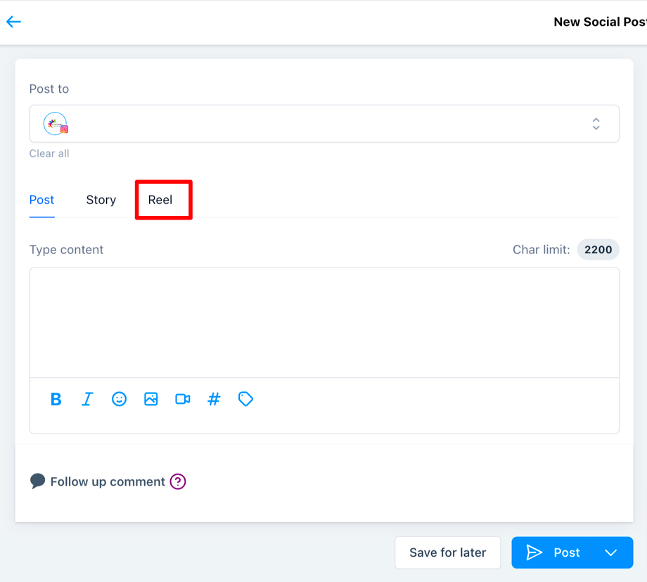 Wählen Sie Reels als Instagram-Inhaltstyp aus.