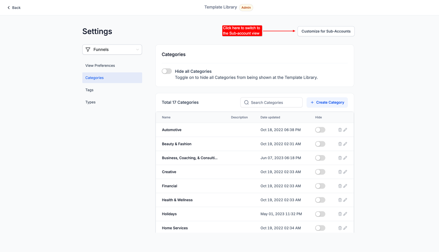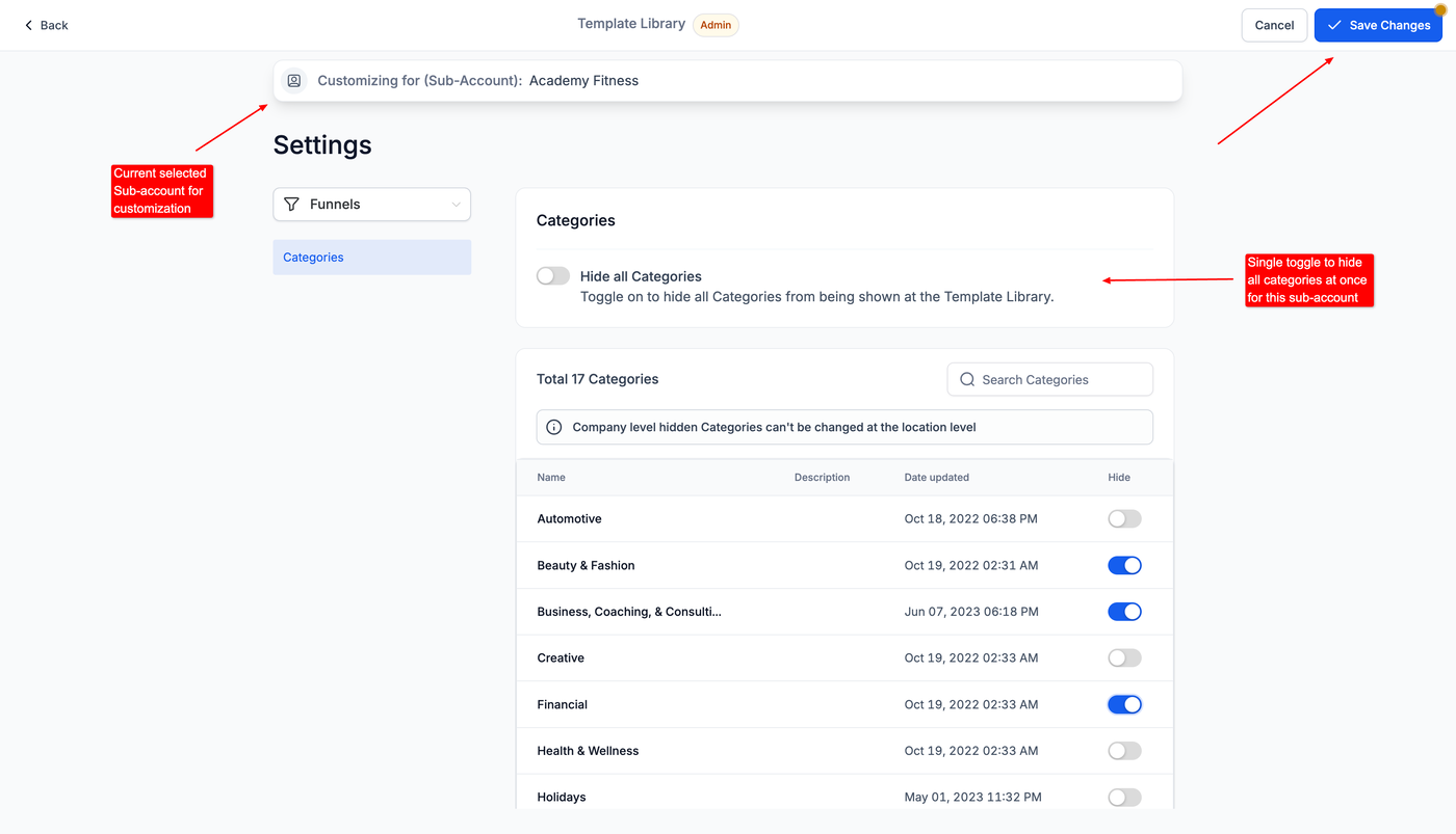 Admins können steuern, welche Inhalte jedem Subaccount angezeigt werden, indem sie die verfügbaren Templates und Kategorien anpassen.