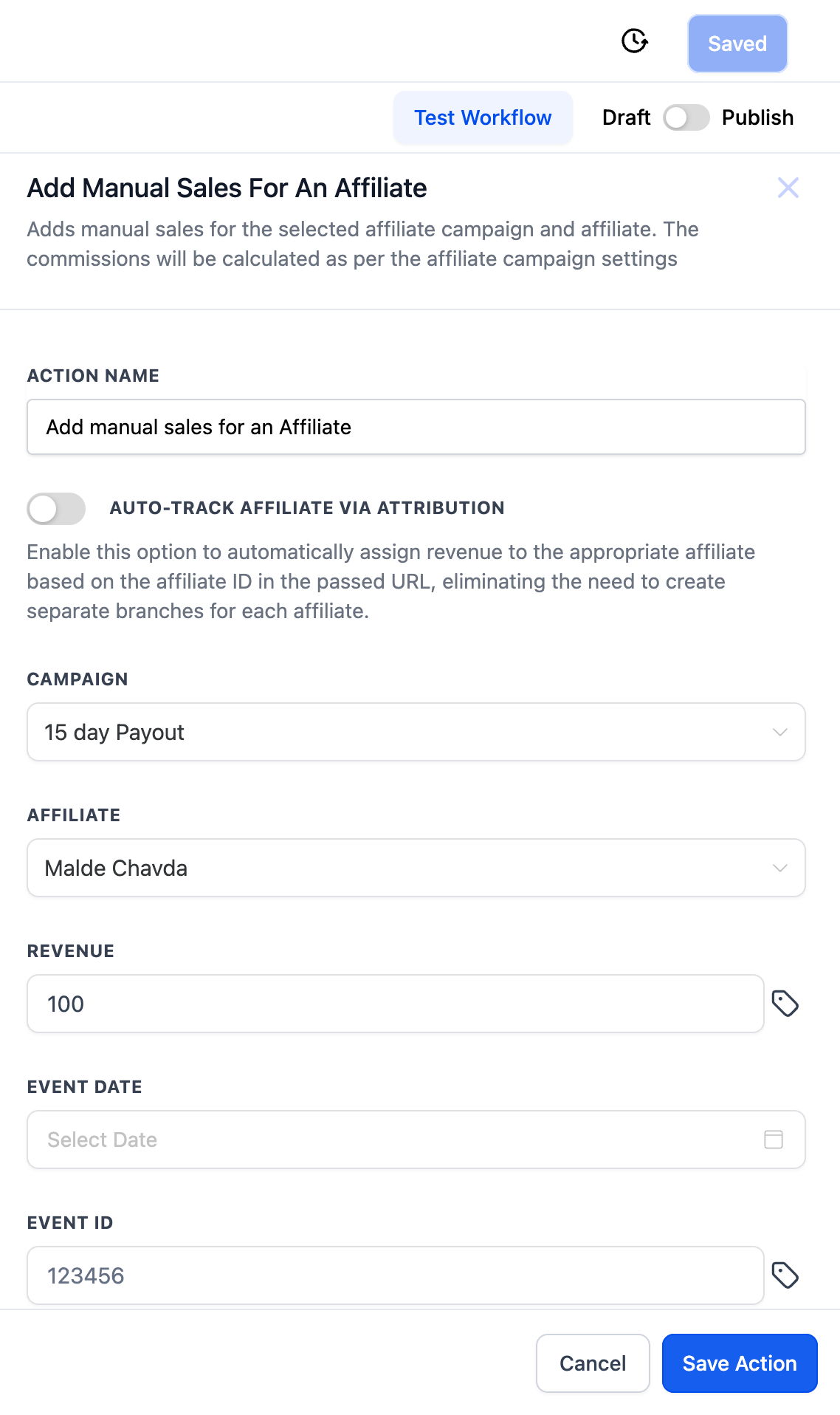 Durch die Verwendung der „Add Manual Sales For An Affiliate“-Aktion kannst du Affiliate-Verkäufe und Provisionsberechnungen automatisieren. Dies bietet eine nahtlose und präzise Methode, um Affiliates für ihre Beiträge zu belohnen. Egal, ob du Online- oder Offline-Verkäufe verwaltest, dieses Workflow-Feature erhöht die Flexibilität und Genauigkeit deines Affiliate-Managements.