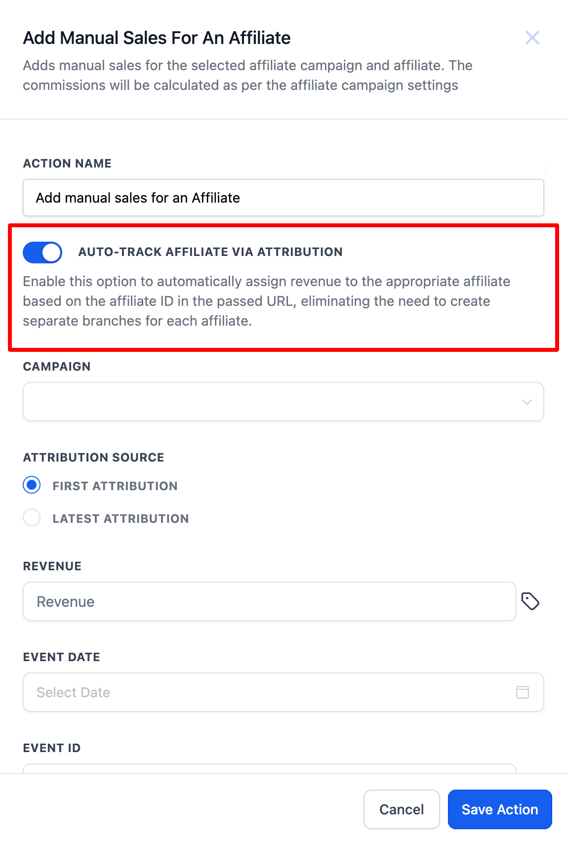 Die „Add Manual Sales For An Affiliate“-Aktion in Workflows ermöglicht es, manuelle Verkäufe effizient bestimmten Affiliates innerhalb ausgewählter Kampagnen zuzuordnen. Durch die Automatisierung dieses Prozesses werden Provisionen genau gemäß den Standardeinstellungen der Kampagne berechnet, was pünktliche Auszahlungen und eine bessere Nachverfolgung von Affiliate-Provisionen sicherstellt. Dieses Feature optimiert Workflows, erhöht die Flexibilität bei der Verwaltung affiliategenerierter Verkäufe und vereinfacht die Provisionsverwaltung.