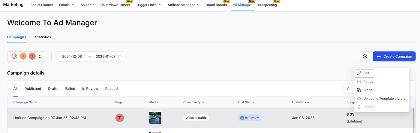 Klicken Sie im Drei-Punkte-Menü der Kampagne auf die Option „Bearbeiten“.
