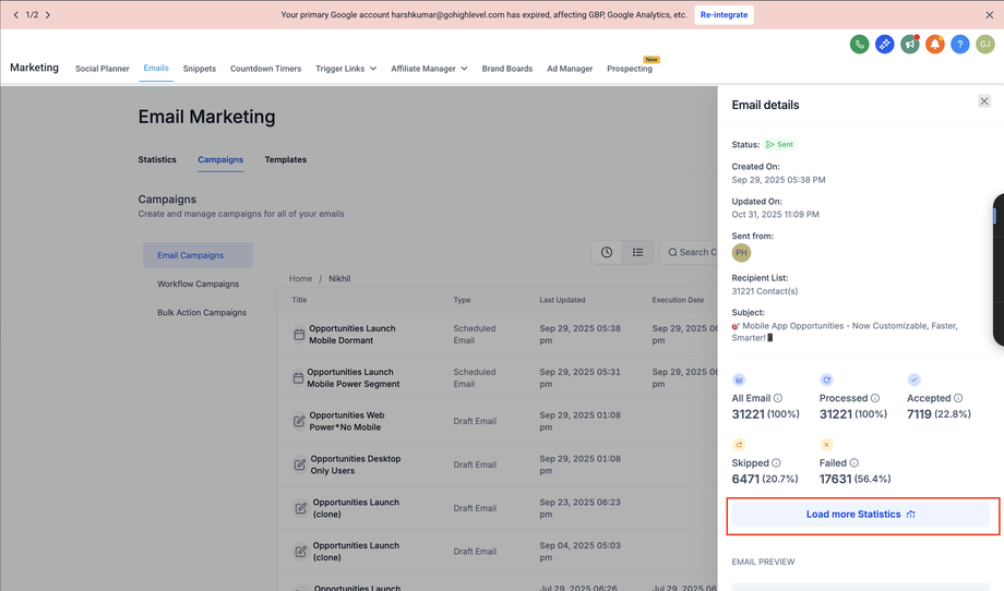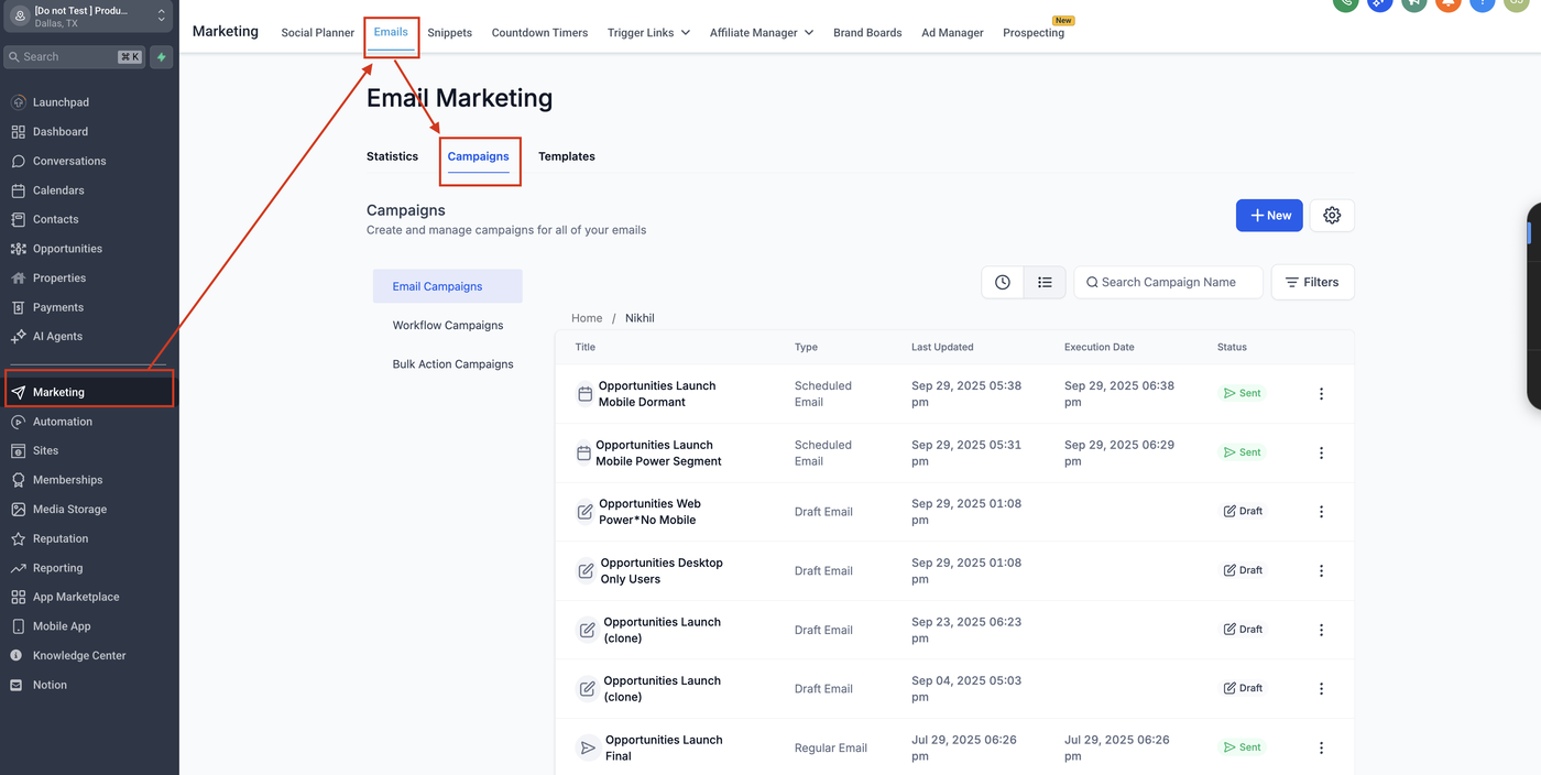 Gehe zu Marketing → E-Mails → Kampagnen.