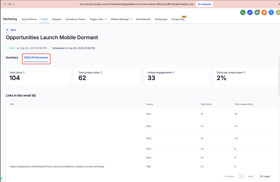 Sobald die E-Mail gesendet und zugestellt wurde, erscheinen die Klick-Aktivitäten im Tab Click-Performance innerhalb der Kampagnenstatistiken.