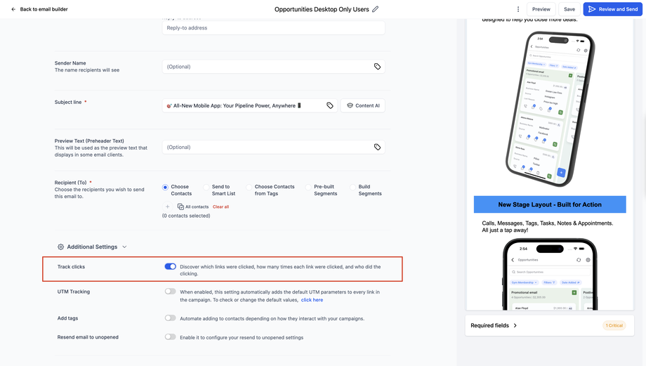Bevor Click-Performance-Daten erfasst werden können, musst du beim Einrichten deiner E-Mail-Kampagne die Option „Klicks verfolgen“ aktivieren.
