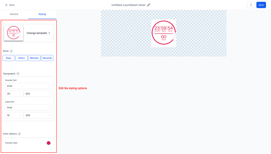 Passe das Design des Timers an – Schriftarten, Farben und allgemeines Erscheinungsbild – um es an dein Branding anzupassen.