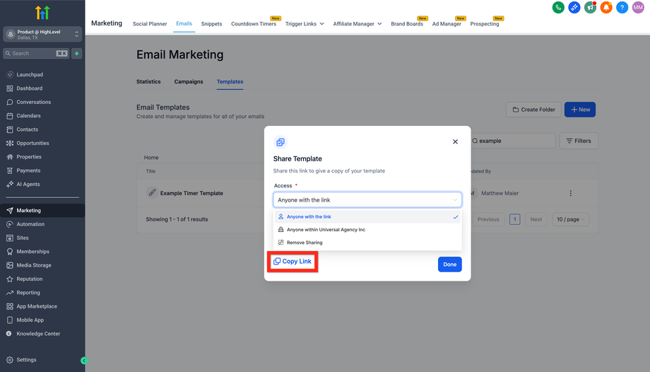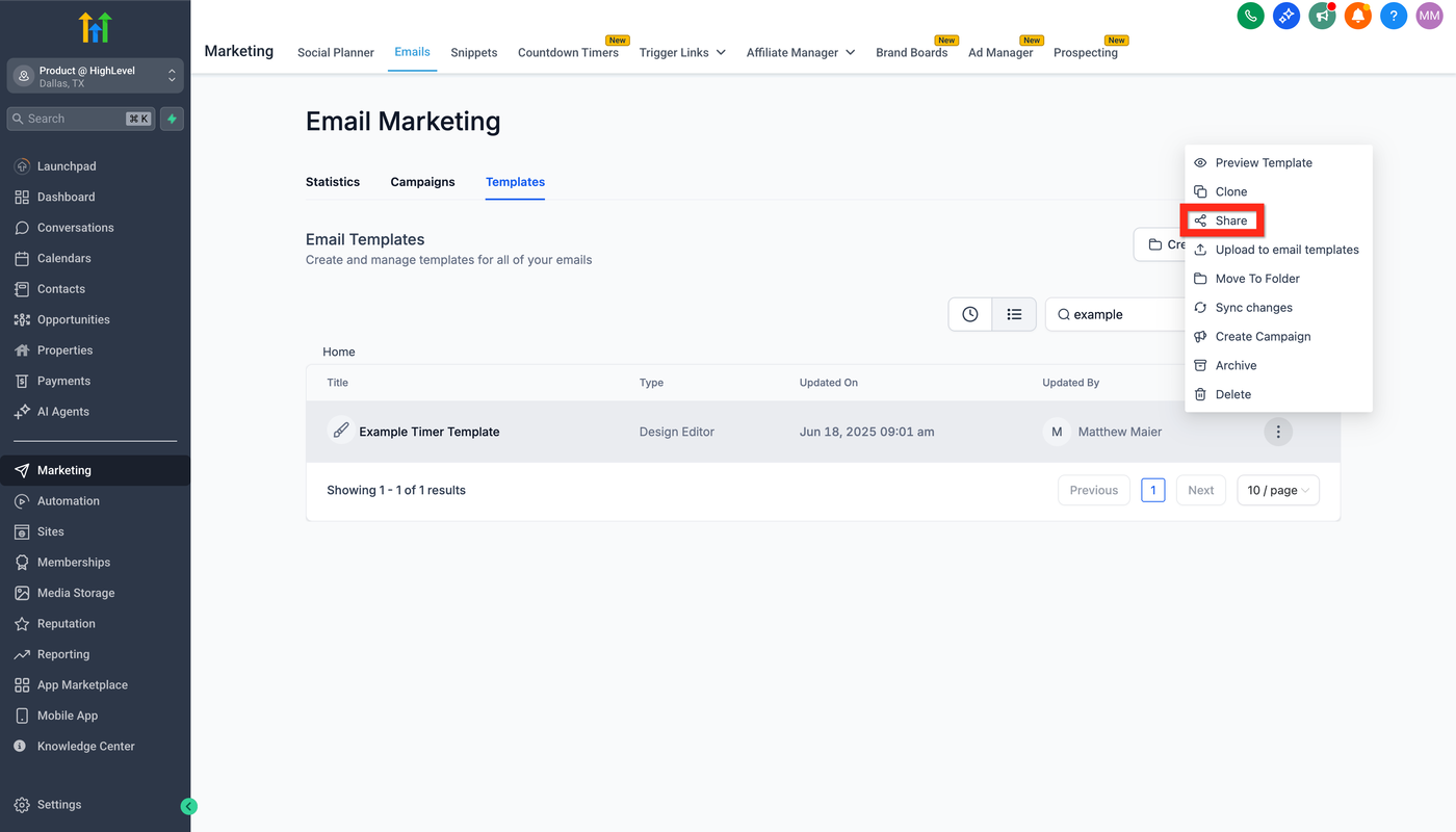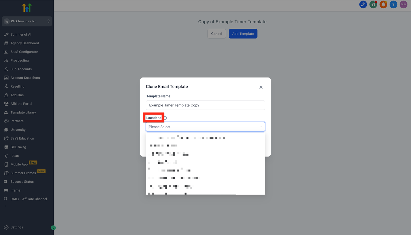 Wähle den Subaccount (Location), in dem das Template kopiert werden soll