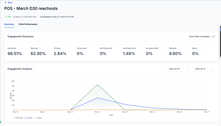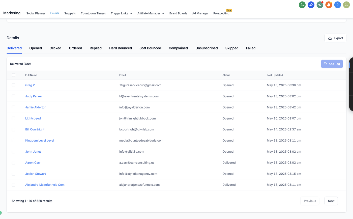 Du kannst außerdem Engagement-Trends über die Zeit betrachten, Conversions analysieren und detaillierte Empfängerinformationen einsehen, wie z. B. wer die E-Mail geöffnet, geklickt oder sich abgemeldet hat.