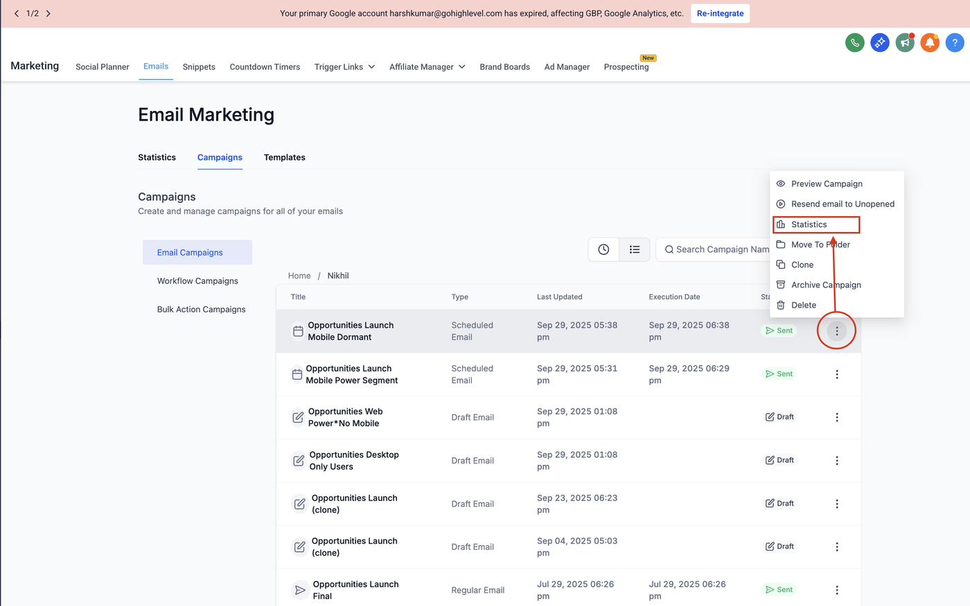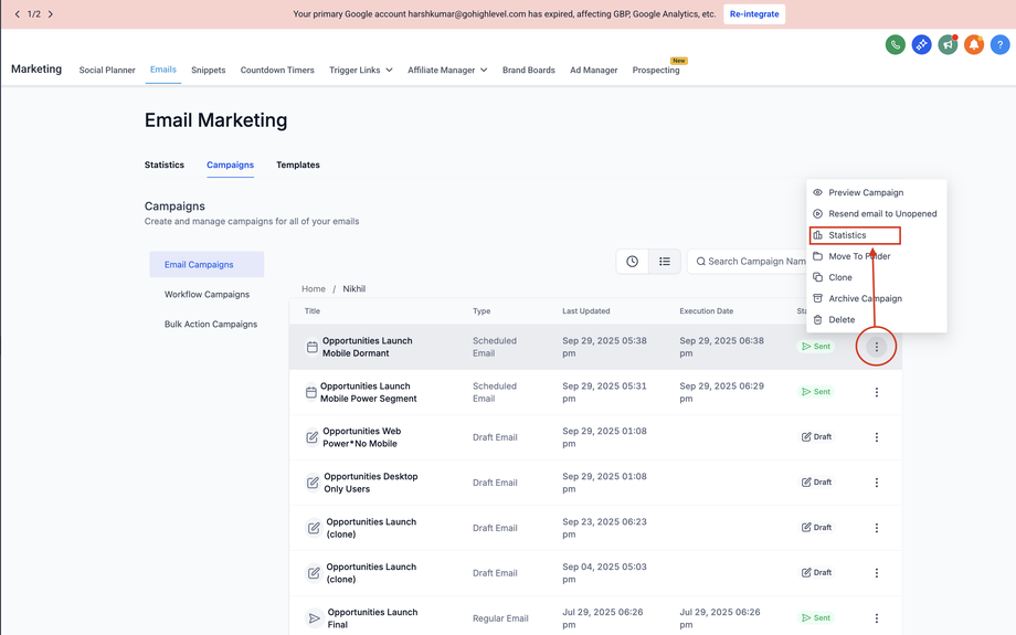 Klicke auf das Drei-Punkte-Menü (⋮) neben dem Kampagnennamen.