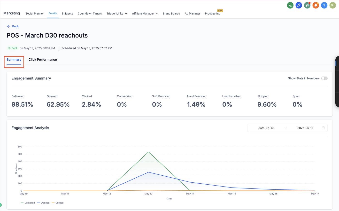 Stelle sicher, dass die E-Mail gesendet und erfolgreich zugestellt wurde. Entwürfe oder geplante Kampagnen zeigen keine Daten.