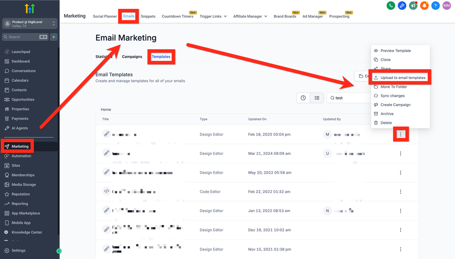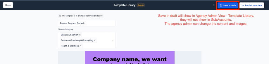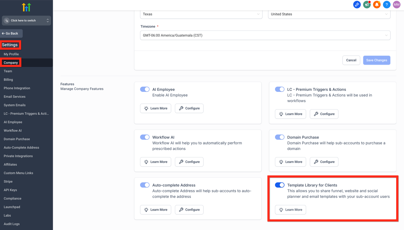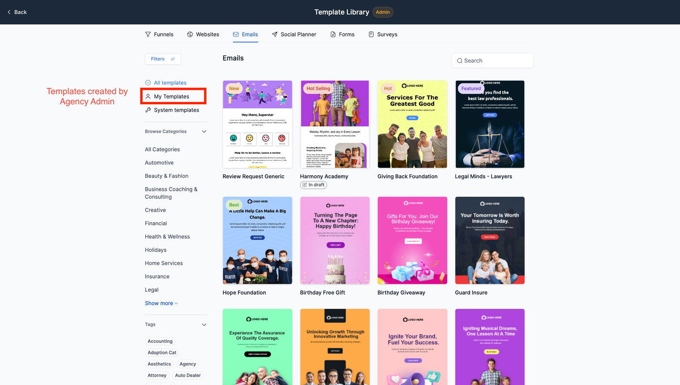 Die Template Library ist eine Sammlung von Bibliotheken mit Vorlagen für bestimmte Produkte (E-Mail, Funnels usw.). Agency-Admins können benutzerdefinierte Templates zu diesen Bibliotheken hinzufügen.