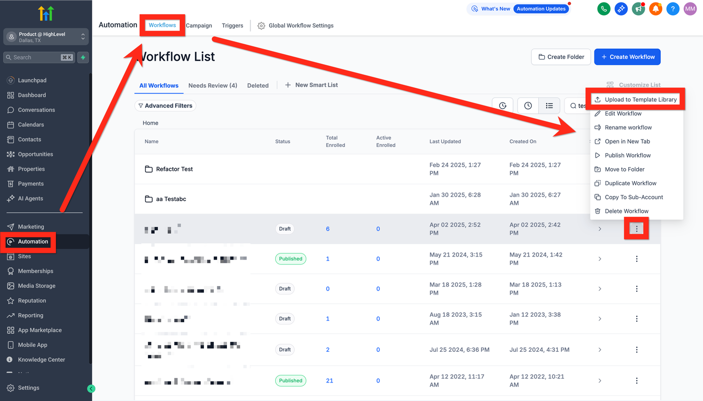 Suchen Sie den gewünschten Workflow, klicken Sie auf das 3-Punkte-Aktionsmenü und wählen Sie Upload to Template Library.