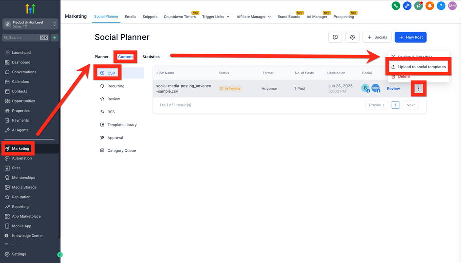 Marketing > Social Planner > Content Tab > CSV Tab
