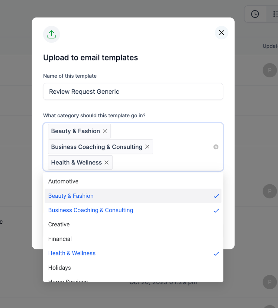 Suchen Sie das gewünschte Template, klicken Sie auf das 3-Punkte-Aktionsmenü und wählen Sie Upload to email templates.