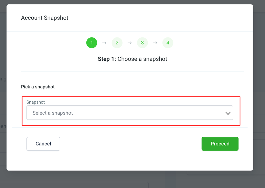 Nach dem Klick auf „Load Snapshot“ wird ein Dialog mit 4 Schritten angezeigt. Im ersten Schritt suchen Sie nach dem Snapshot, den Sie vom übergeordneten Standort erstellt haben und in den gewünschten Standort laden möchten.