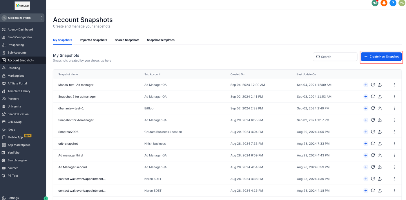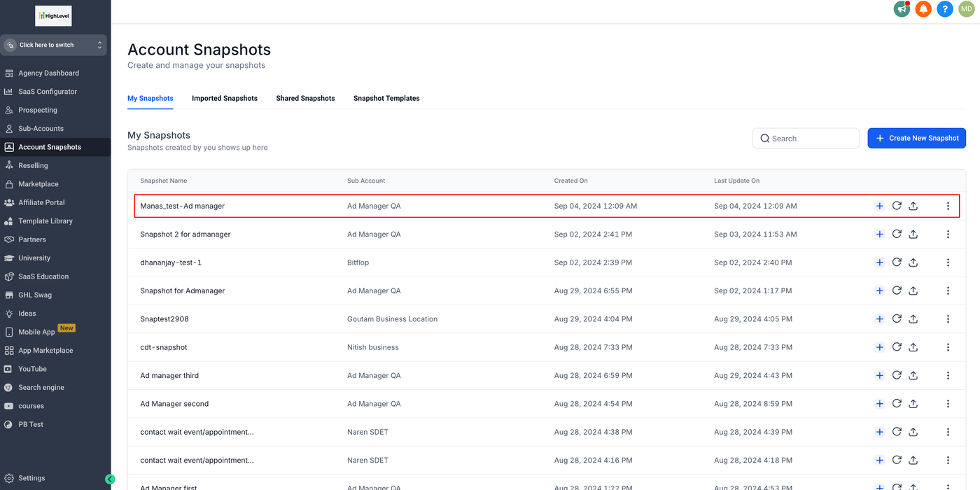 Mit Snapshots können Agenturnutzer während des Onboardings Zeit sparen und ihren Standorten gewünschte Werbekampagnen als Startvorlagen bereitstellen. Dadurch können Agenturen Snapshots ihrer gewünschten oder leistungsstarken Werbekampagnen in einem Sub-Account erstellen und diese einfach in andere bestehende oder neue Sub-Accounts laden, sodass Nutzer nahtlos vorkonfigurierte Werbekampagnen erhalten. Nachfolgend sind die Schritte aufgeführt, die erforderlich sind, um Werbekampagnen von einem Standort zu einem anderen zu duplizieren.