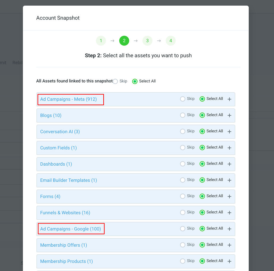 In der im zweiten Schritt angezeigten Asset-Liste suchen Sie nach den Assets „Ad Campaigns - Meta“ und „Ad Campaigns - Google“ und wählen eine oder alle Werbekampagnen aus, die Sie in den Ziel-Standort laden möchten.