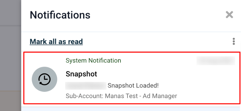 Sobald ein Snapshot erfolgreich in den gewünschten Sub-Account geladen wurde, wird eine Benachrichtigung unter dem Glocken-Symbol oben rechts in der Anwendung angezeigt, die bestätigt, dass das ausgewählte Snapshot-Asset erfolgreich kopiert wurde.