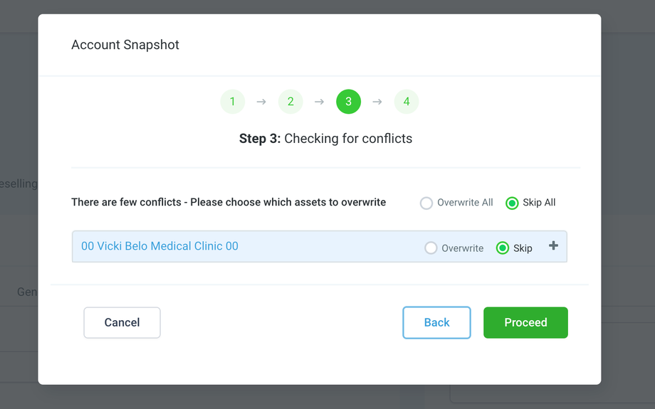 Klicken Sie auf „Proceed“, nachdem Sie die Werbekampagnen-Assets ausgewählt haben. Sie gelangen dann zum nächsten Schritt, in dem Konflikte im Ziel-Standort überprüft werden. Falls Konflikte bestehen, werden die entsprechenden Details in Schritt 3 angezeigt, und Sie haben die Möglichkeit, die betroffenen Elemente zu überspringen oder sie zu überschreiben.