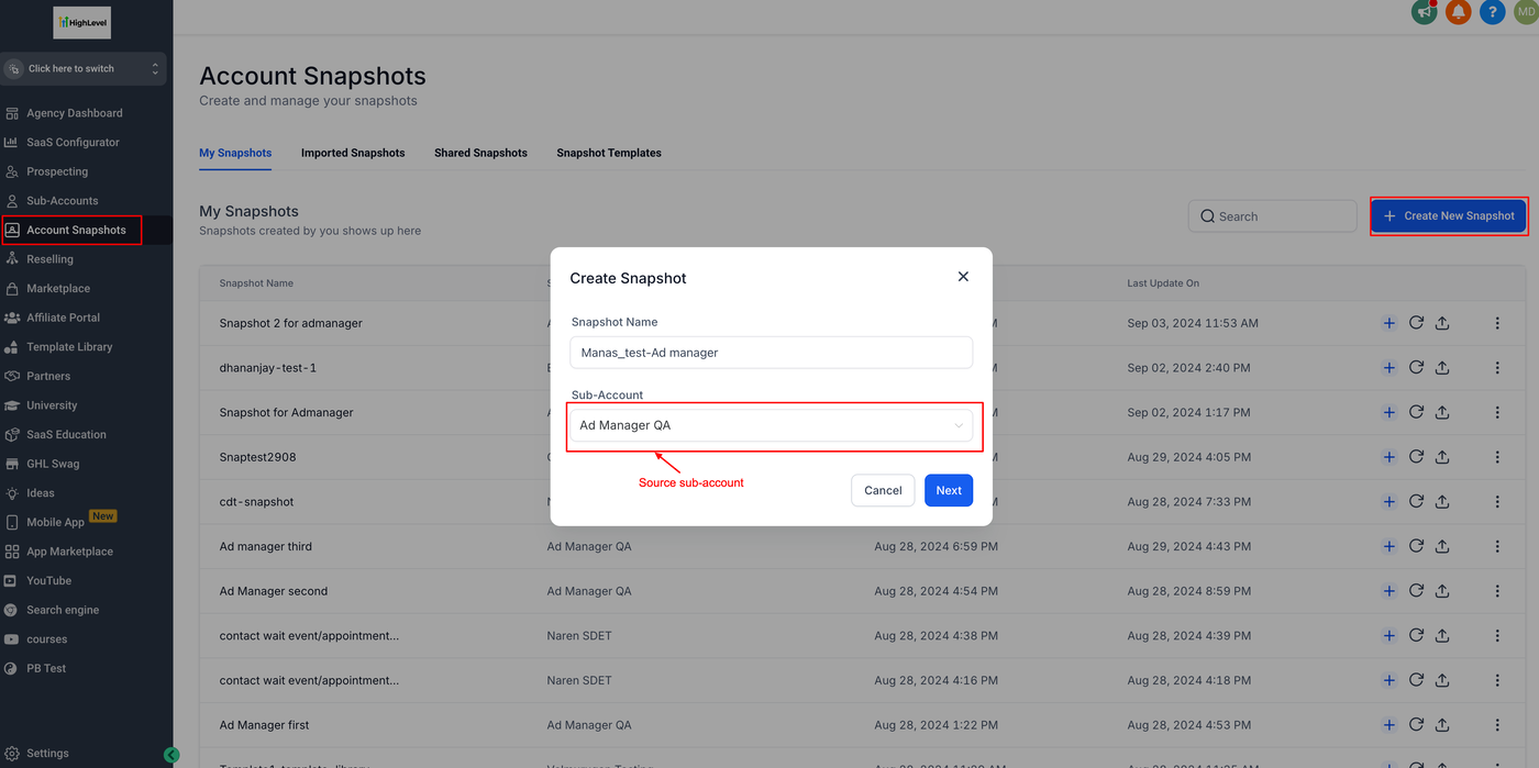 Klicken Sie auf „Create New Snapshot“ und vergeben Sie einen Namen. Wählen Sie den Quell-Sub-Account aus, in dem sich Ihre idealen Werbekampagnen befinden, die Sie mit anderen Standorten teilen möchten.