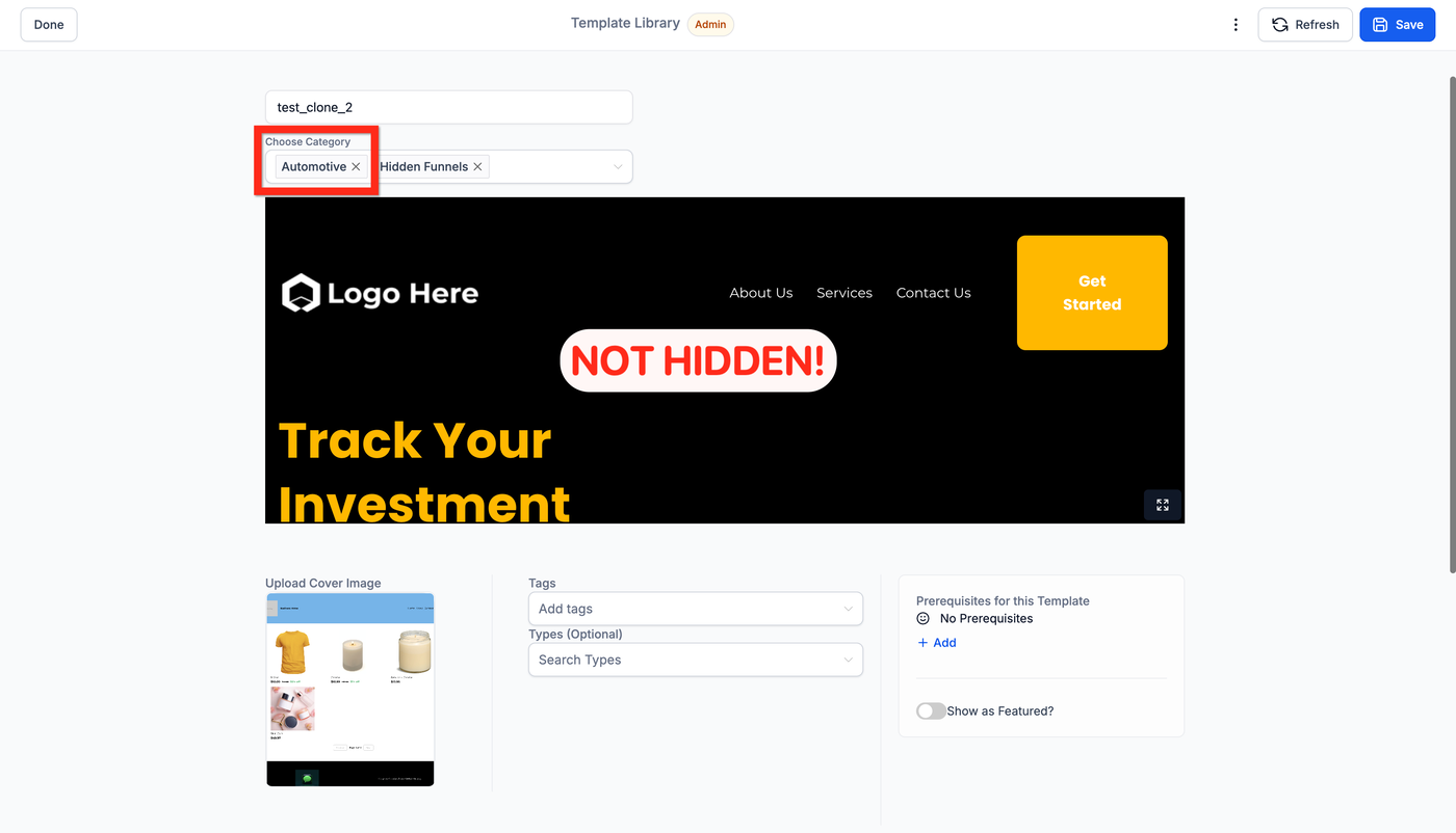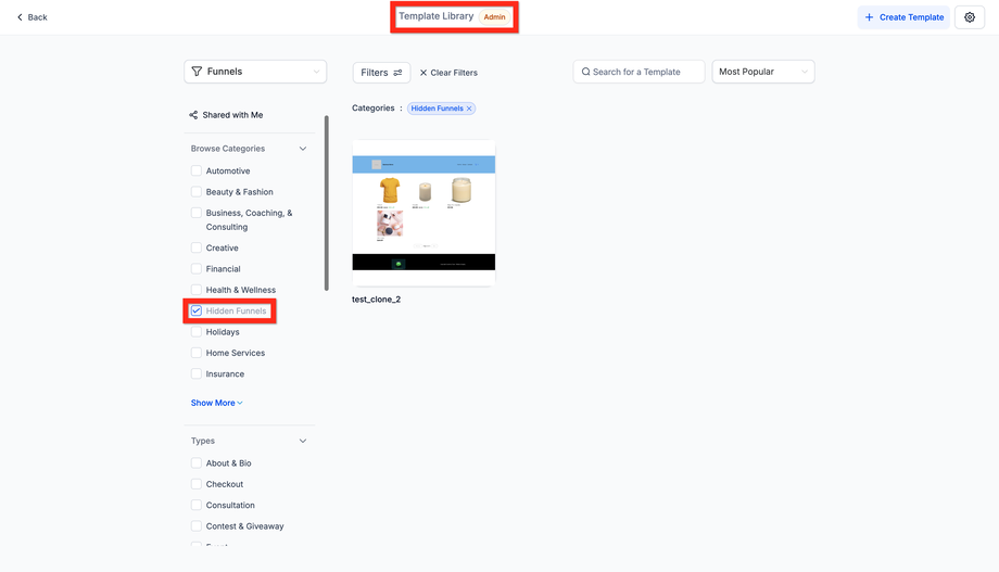 Kehre zur Agentur-Template-Bibliothek zurück, um zu bestätigen, dass du die versteckte Kategorie und die Templates darin sehen kannst.