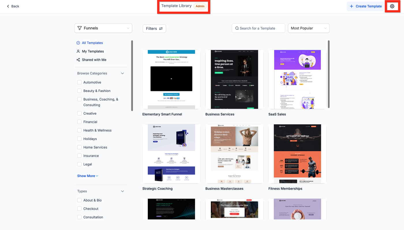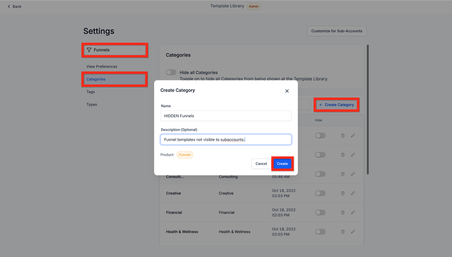 Wähle in den Template-Bibliothek Admin-Einstellungen eines der Produkte (z. B. Funnels), klicke auf Kategorien > Kategorie erstellen.