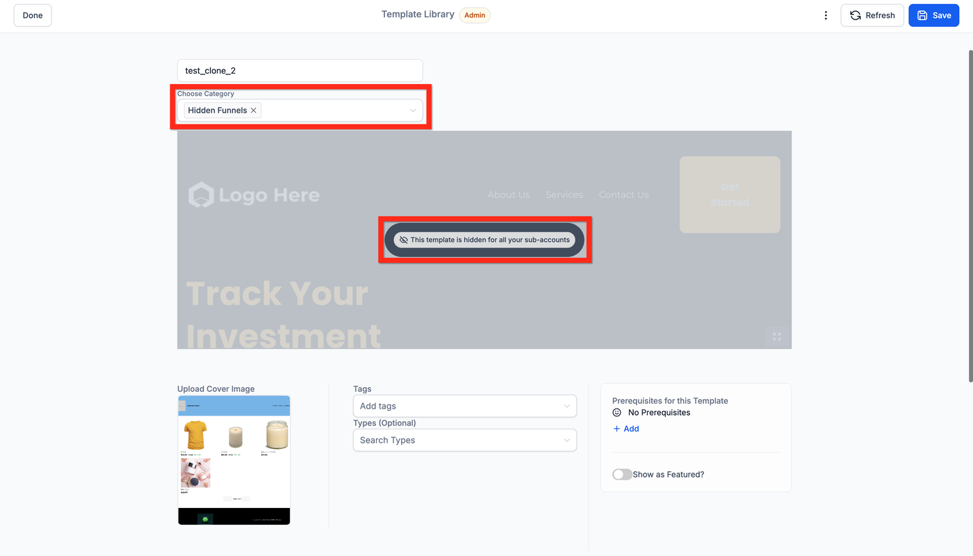 Überprüfe, dass das Vorschaubild des Templates ein graues Feld mit dem Hinweis „Dieses Template ist für alle deine Subaccounts verborgen“ hat.