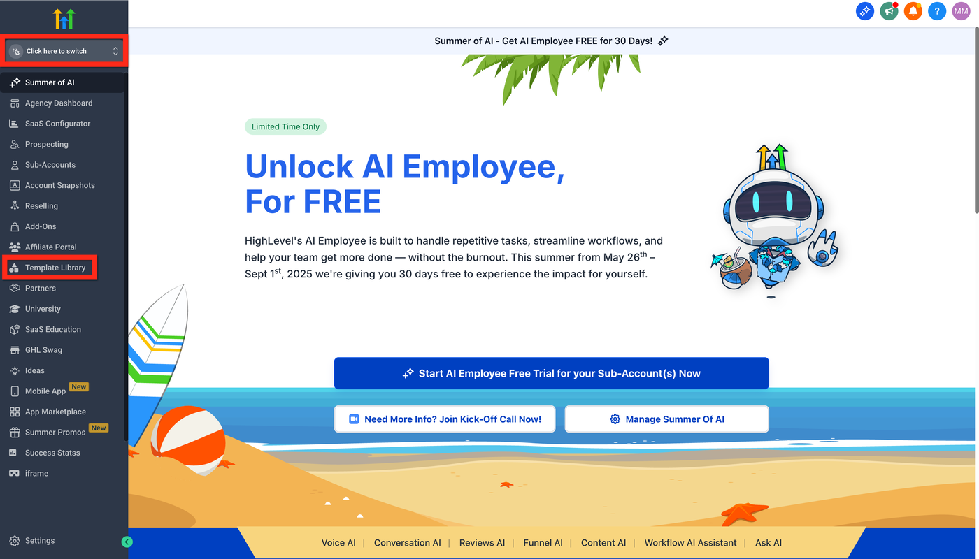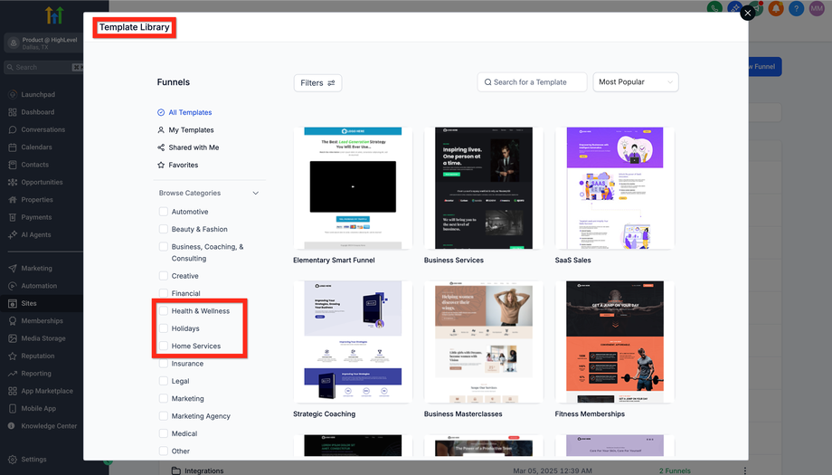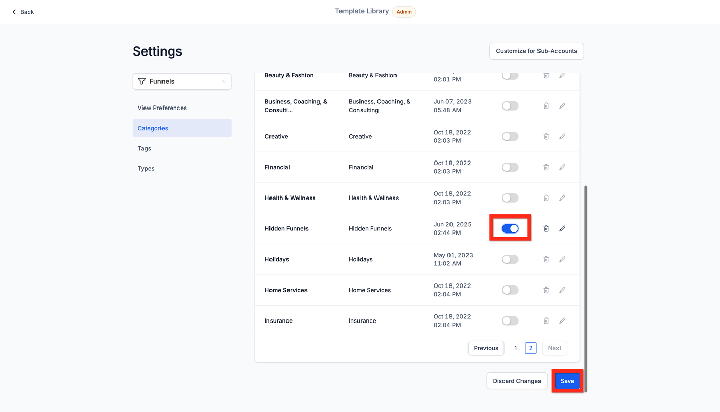 Navigiere zu Subaccount > [Produkt] (z. B. Funnels, wenn deine versteckte Kategorie bei Funnels war)