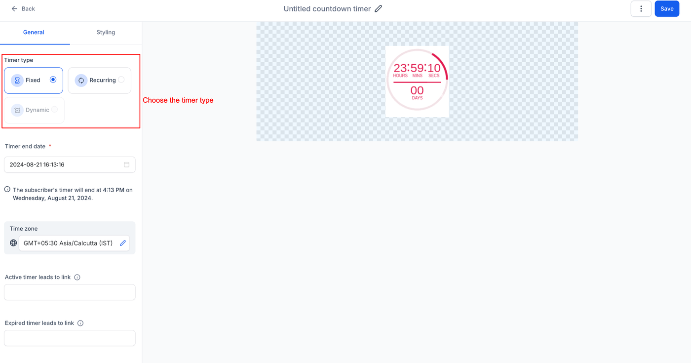 Wähle den gewünschten Timer-Typ: Fixed, Recurring oder Dynamic.
